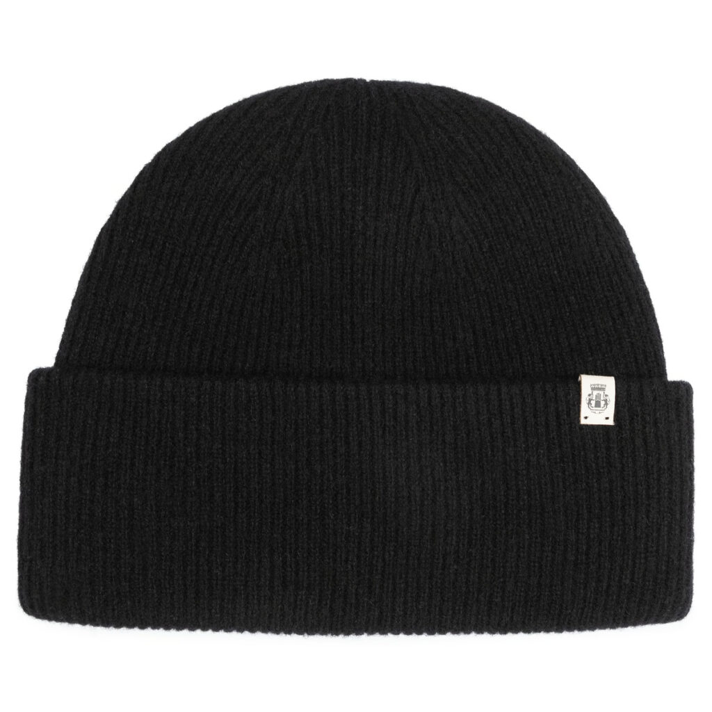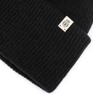 Vācu zīmola Roeckl smalki rievota adījuma cepure melnā krāsā. Izgatavota no mīkstas merino vilnas dzijas. Papildināta ar kontrastējošu zīmola logotipa emblēmu uz platā atloka.