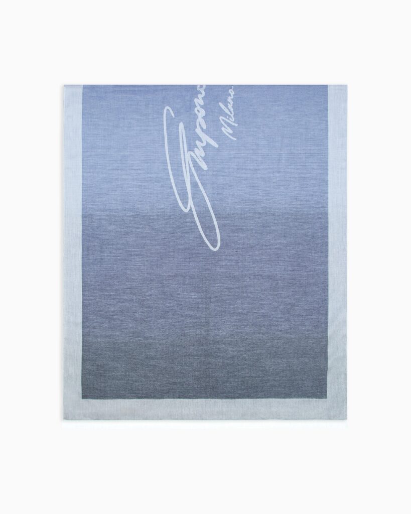 Itāļu luksusa zīmola Emporio Armani liela unisex dizaina šalle dūmakaini zilā toņu pārējā ar zīmola logotipa akcentu. Izgatavota no viegla un gaisīga modāla un viskozes maisījuma materiāla. Papildināta ar smalku bārkstiņu apdari nobeigumā.