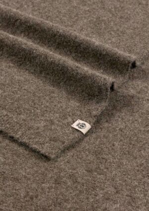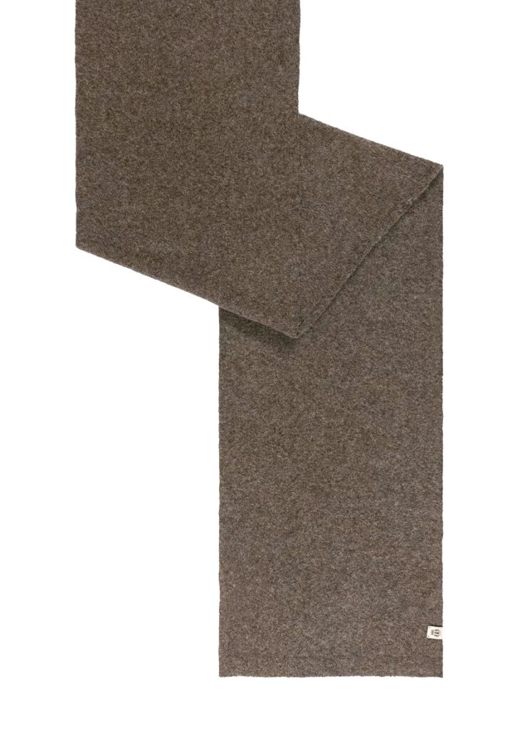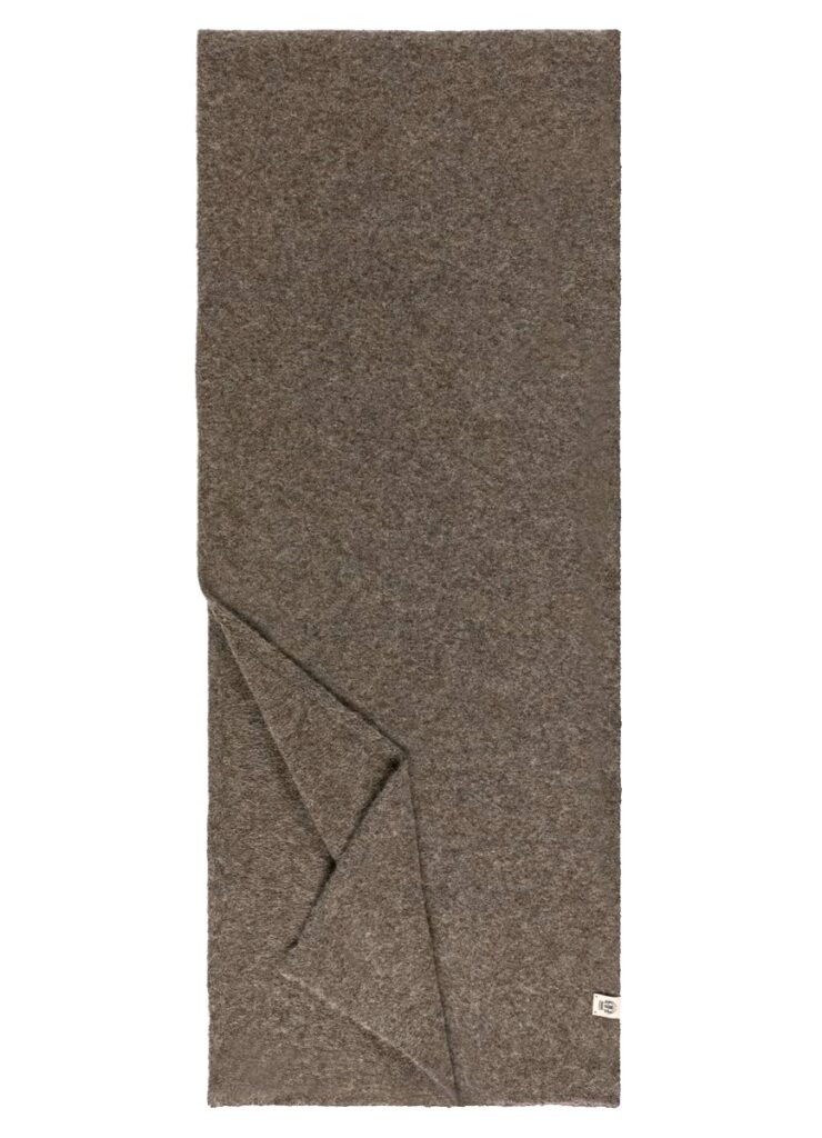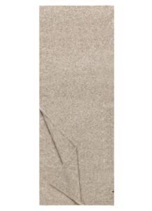 Vācu zīmola Roeckl universāla adītā šalle pelēcīgi brūnā krāsā. Izgatavota no viegli pūkainas un siltas alpakas un jaka maisījuma dzijas. Papildināta ar smalki rievotu apkšmalu apdari un zīmola logotipa emblēmu.