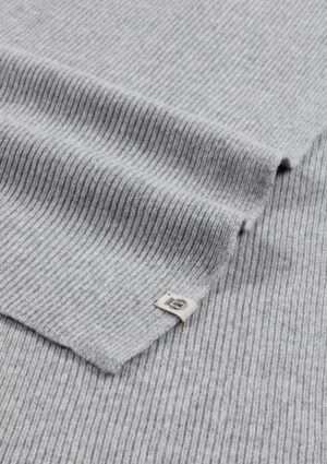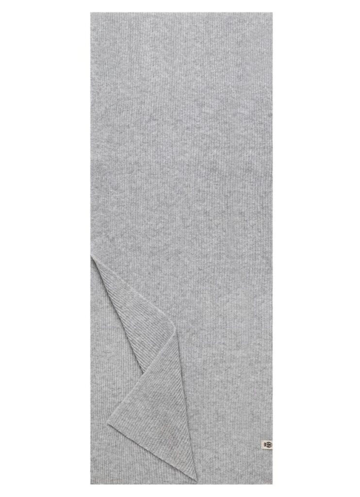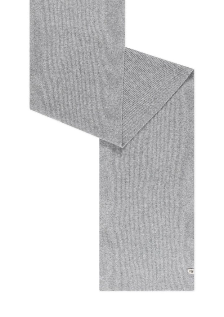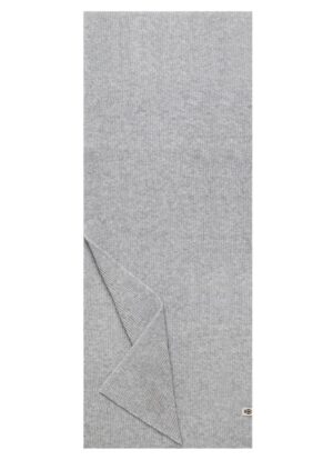 Vācu zīmola Roeckl universāla smalki rievota adījuma šalle pelēkā krāsā. Izgatavota no mīkstas merino vilnas dzijas. Papildināta ar viegli kontrastējošu zīmola logotipa emblēmu.