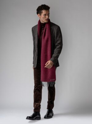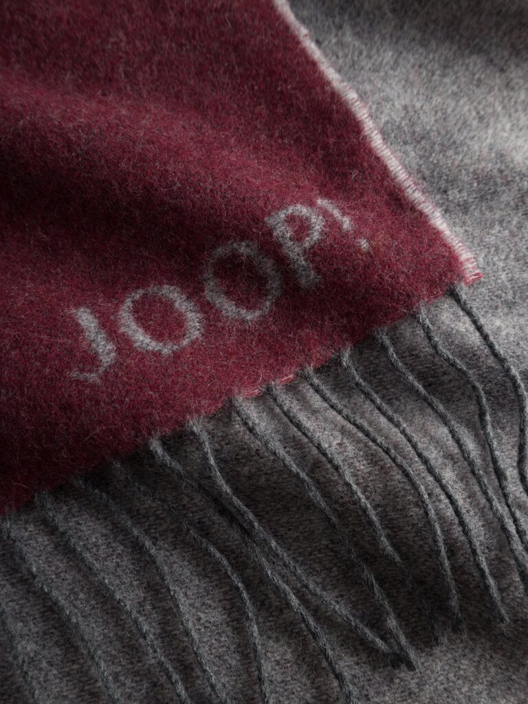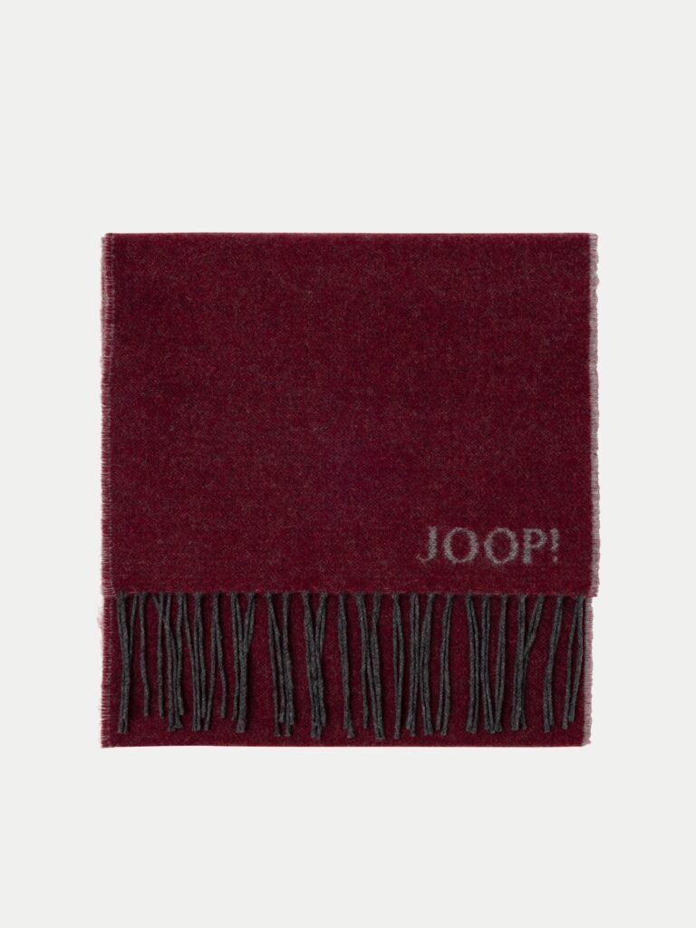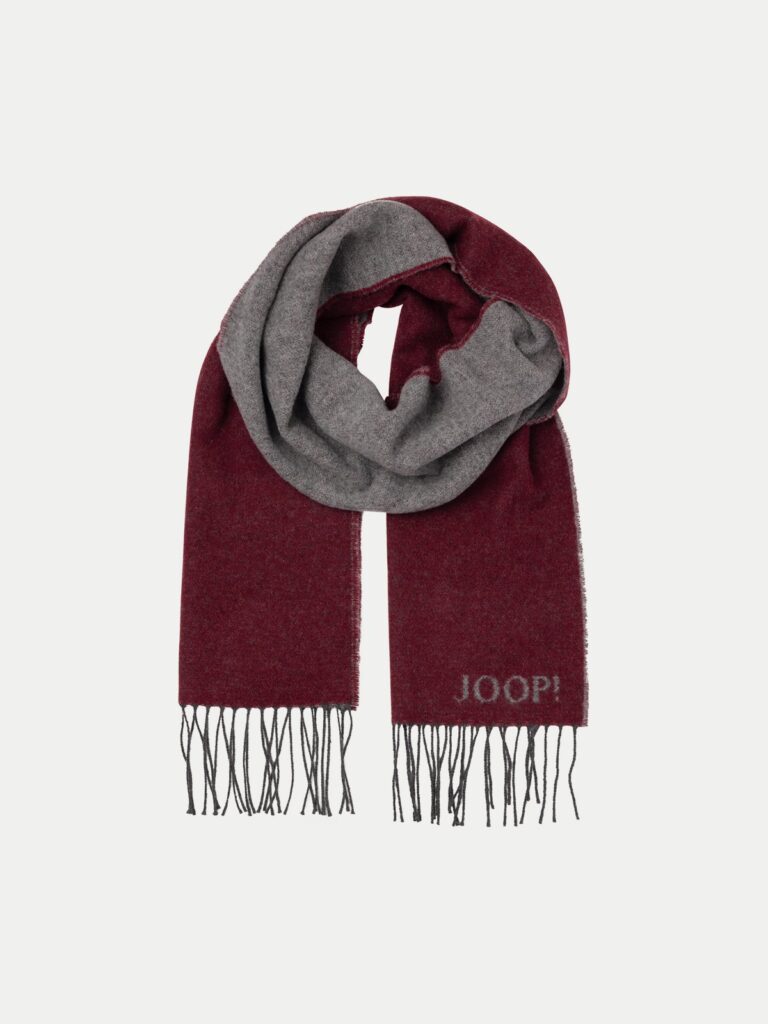 Vācu modes zīmola Joop! divkrāsu šalle tumši sarkanā un pelēkā krāsā. Izgatavota no mīksta vilnas un kokvilnas maisījuma materiāla. Papildināta ar ieaustu logo akcentu un garām bārkstīm apdares nobeigumā.