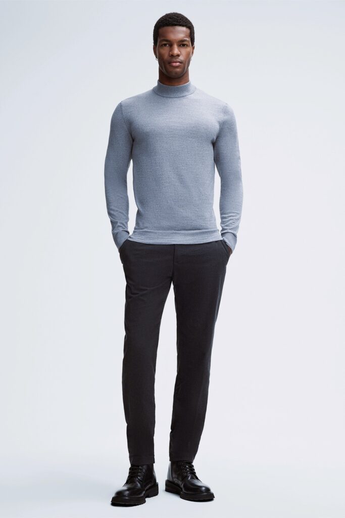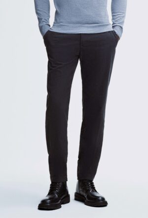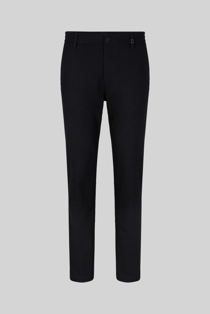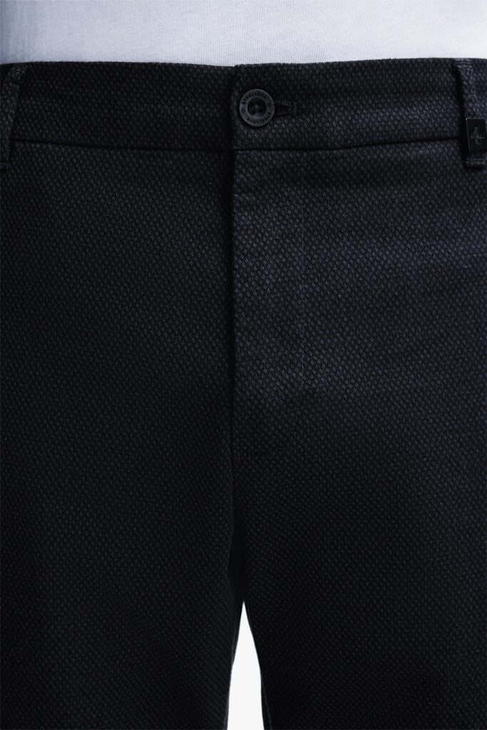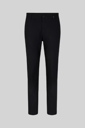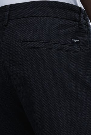 Šveices modes zīmola Strellson universālas vīriešu chino stila bikses tumšā, nakts zilā krāsā ar smalki raibu struktūru. Izgatavotas no elastīga kokvilnas un viskozes maisījuma materiāla. Papildinātas ar daļēji elastīgu jotasvietu sānos un zīmola logotipa akcentiem.