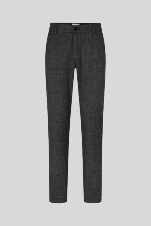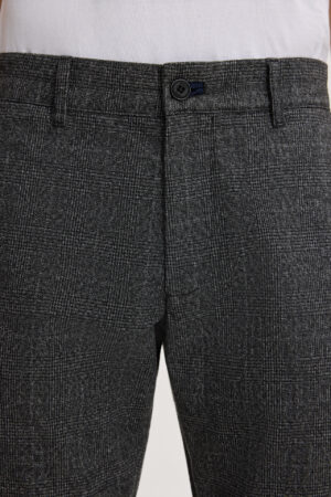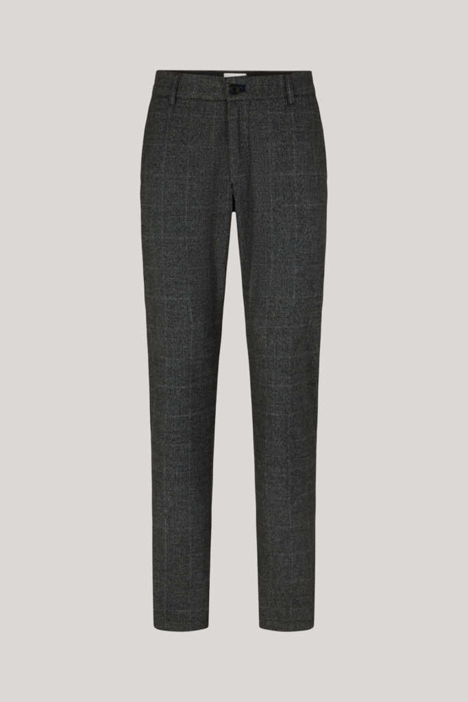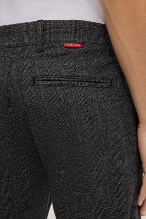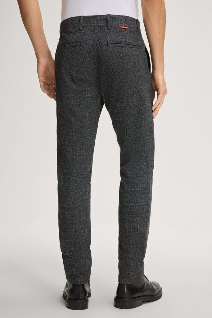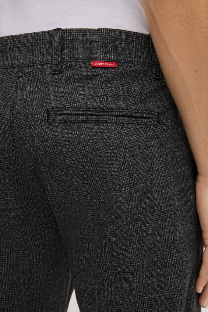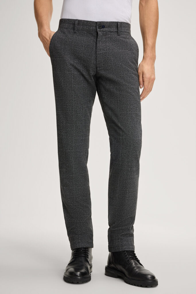 Vācu modes zīmola Joop! tumši pelēkas vīriešu chino stla bikses ar smalku, rūtotu rakstu. Izgatavotas no viegli elastīga kokvilnas un viskozes maisījuma materiāla. Papildinātas ar košu zīmola Joop! Jeans logo akcentu mugurpusē