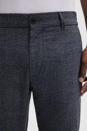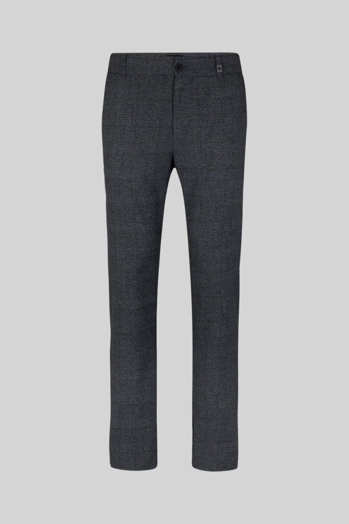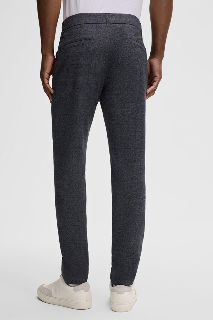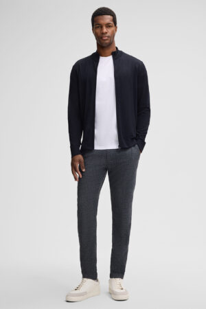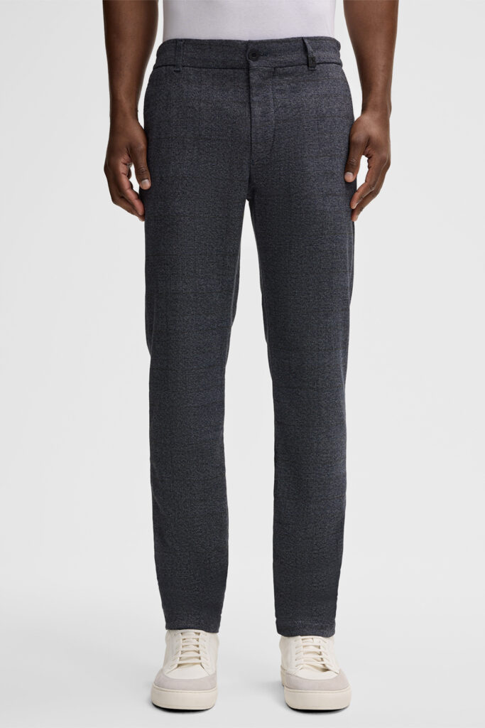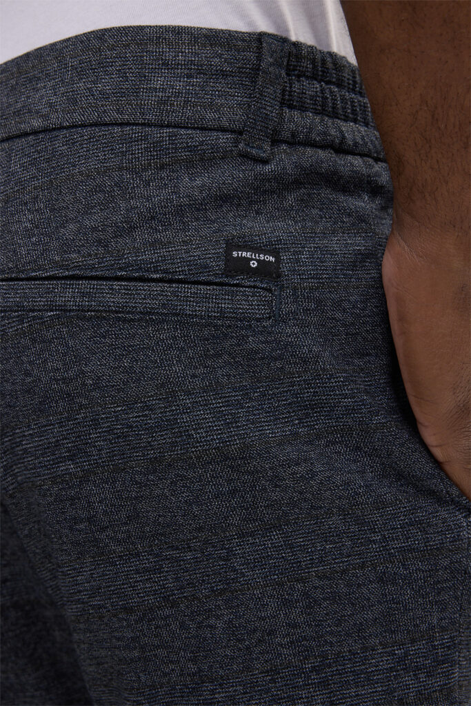 Šveices modes zīmola Strellson tumši pelēcīgi zilas chino stila vīriešu bikses ar neuzkrītošu dizaina rakstu. Izgatavotas no viegli elastīga viskozes un pārstrādāta poliestera materiāla. Papildinātas ar sānos elastīgu jostasvietu un zīmola logotipa detaļām.