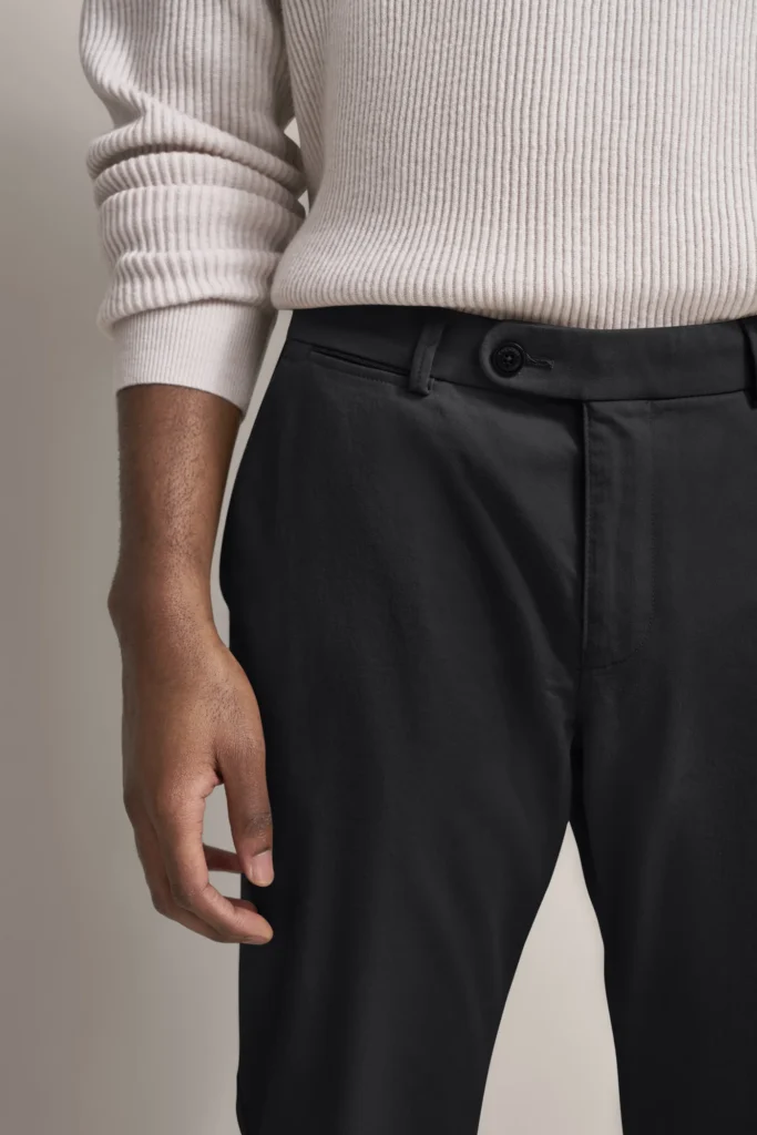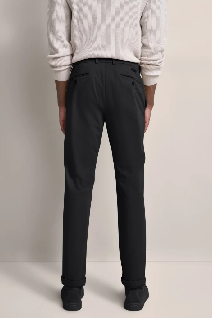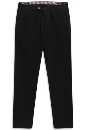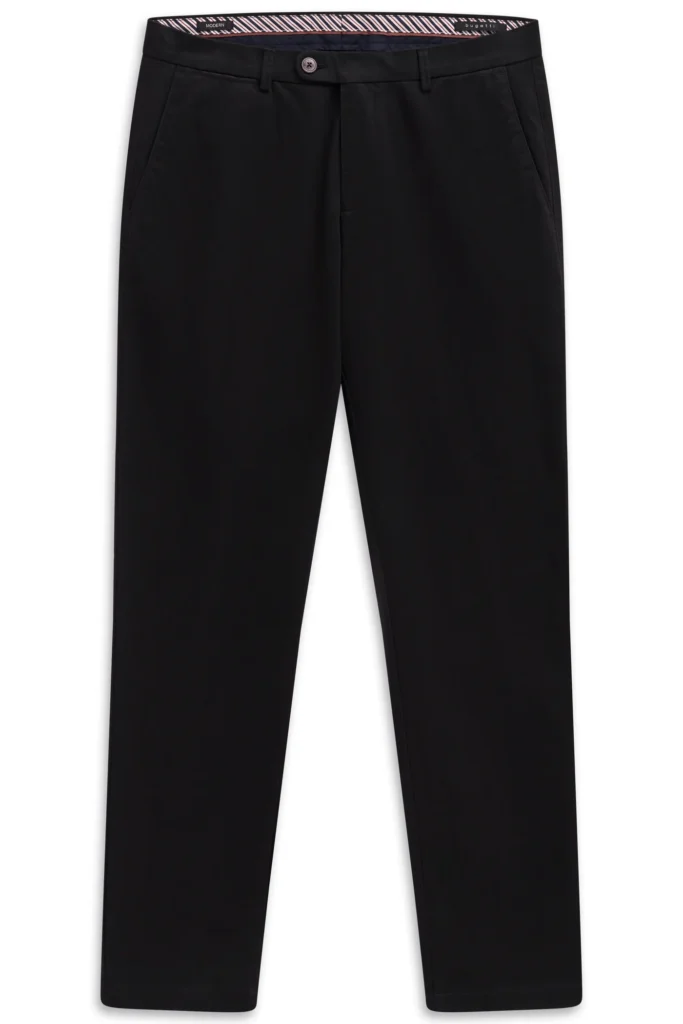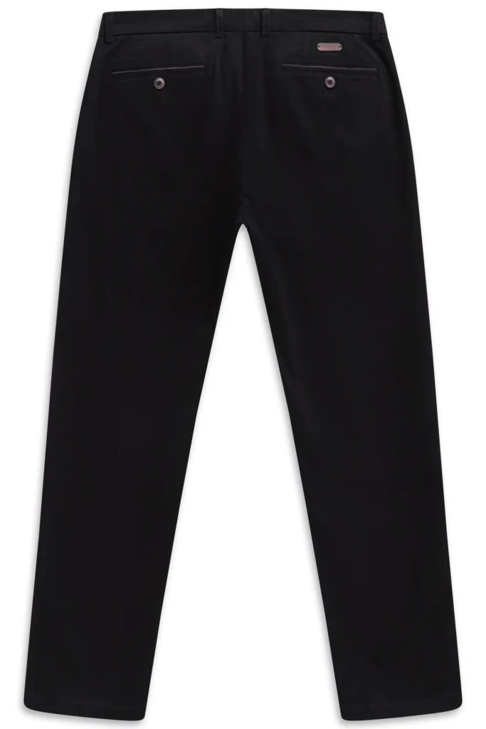 Vācu modes zīmola Bugatti komfortablas moderna piegriezuma vīriešu bikses melnā krāsā. Izgatavotas no mīksta, blīva un elastīga luksusa kvalitātes kokvilnas materiāla. Papildinātas ar piecu kabatu dizainu un smalkām zīmola logotipa detaļām.
