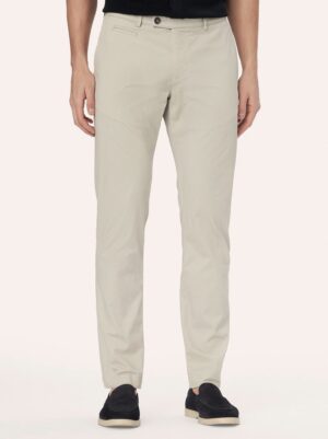 Vācu modes zīmola Bugatti īpaši komfortablas vīriešu chino stila bikses gaiši pelēcīgi bēšā krāsā. Izgatavotas no mīksta un elastīga kokvilnas materiāla ar soft struktūru. Papildinātas ar iešūtu monētu kabatiņu un smalkām zīmola logotipa detaļām.