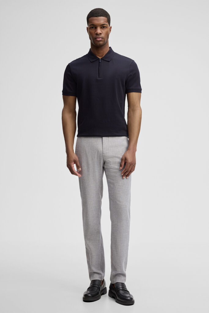 Šveices modes zīmola Strellson vīriešu chino stila bikses gaiši zilpelēkā krāsā. Izgatavotas no bio kokvilnas, linu un viskozes maisījuma materiāla ar viegli raibu tekstūru. Papildinātas ar smalkiem zīmola logotipa akcentiem.