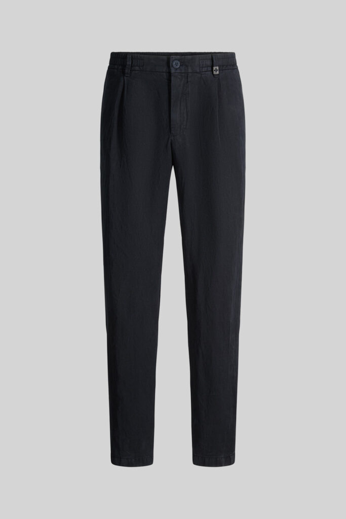 Šveices modes zīmola Strellson vīriešu chino stila bikses ar elastīgu jostasvietu tumši pelēkzilā krāsā. Izgatavotas no komfortabla liocela un linu materiāla. Papildinātas ar nelielām ielocēm un smalkām zīmola logotipa detaļām.