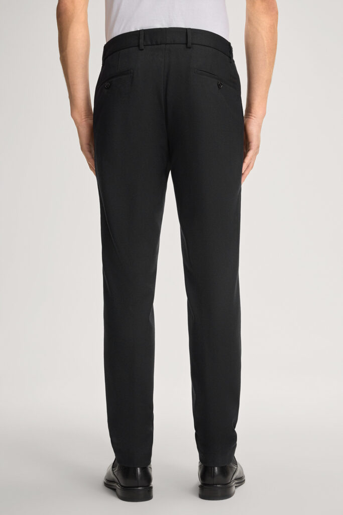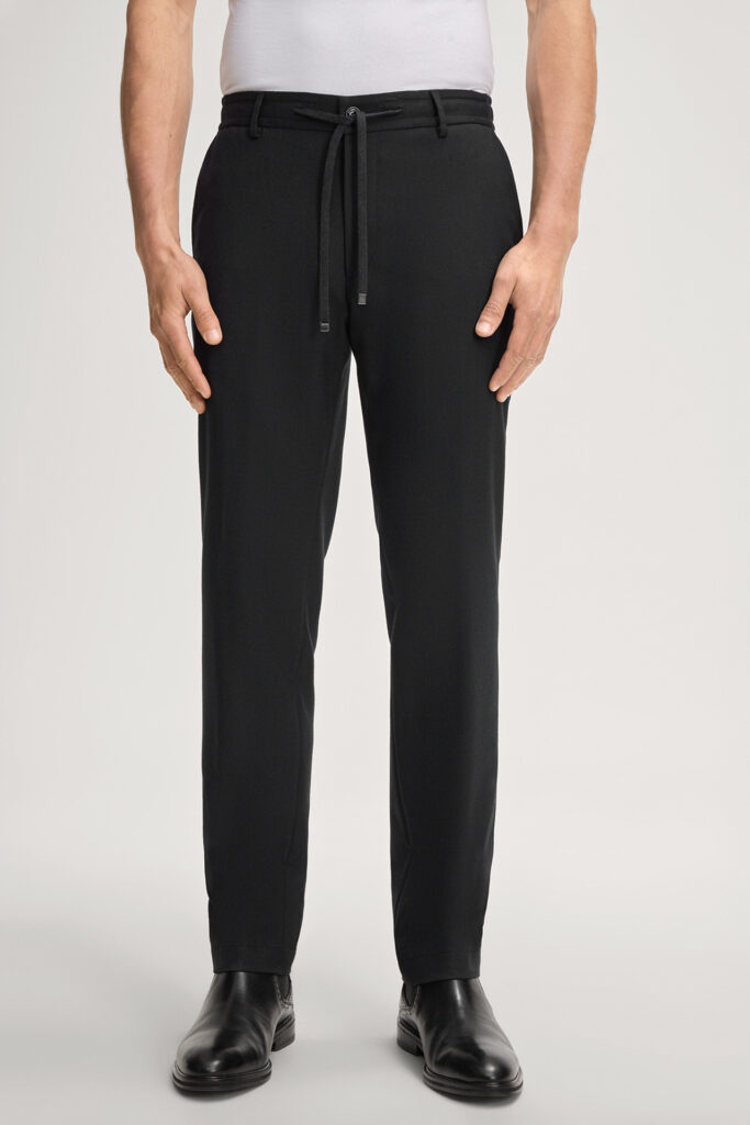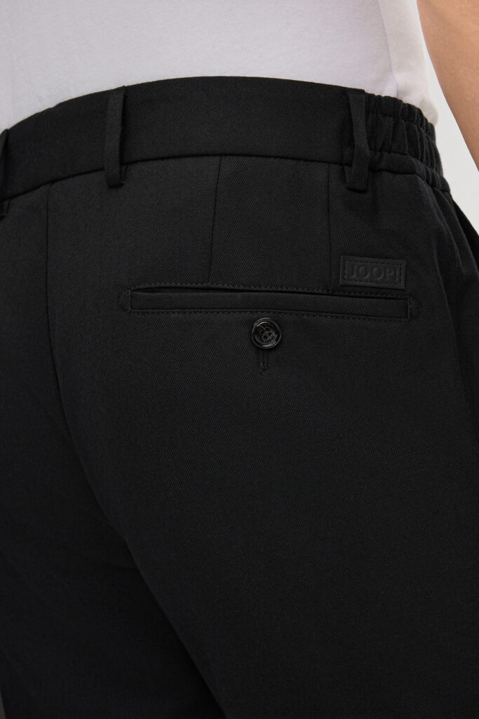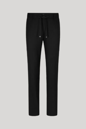 Vācu modes zīmola Joop! komfortablas vīriešu bikses melnā krāsā. Izgatavotas no elastīga vilnas maisījuma materiāla. Papildinātas ar sānos elastīgu, sasienamu jostasvietu un zīmola logotipa akcentu pie kabatas mugurpusē.