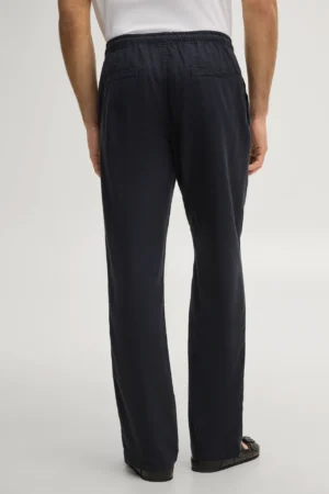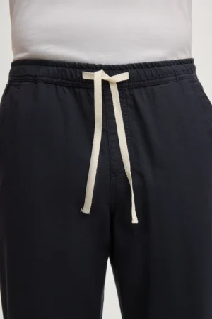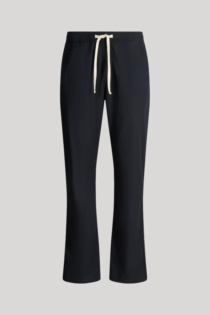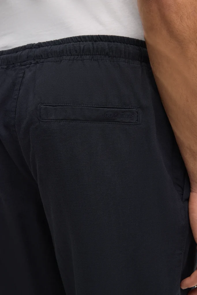Vācu modes zīmola Joop! tumši zilas vīriešu bikses ar elastīgu sasienamo jostasvietu. Izgatavotas no viegla liocela un kokvilnas materiāla. Papildinātas ar rāvējslēdzēja aizdares kabatu sānu vīlē un smalku vientoņa logo izšuvumu uz kabatas mugurpusē.
