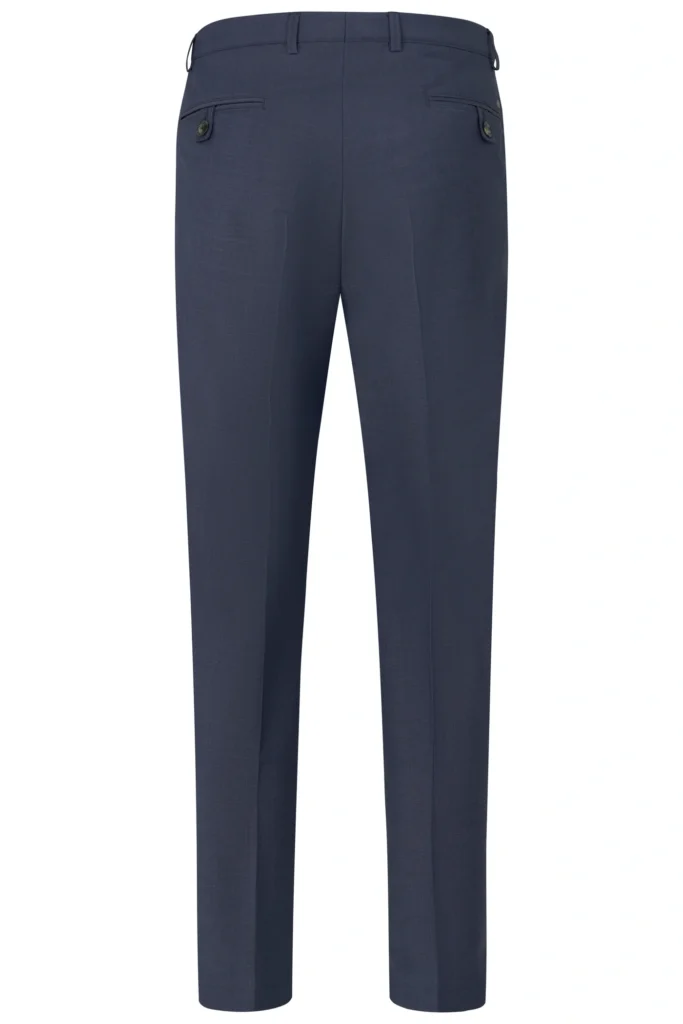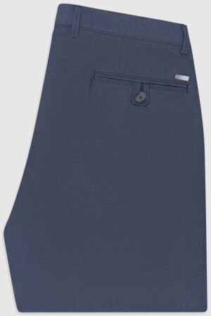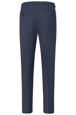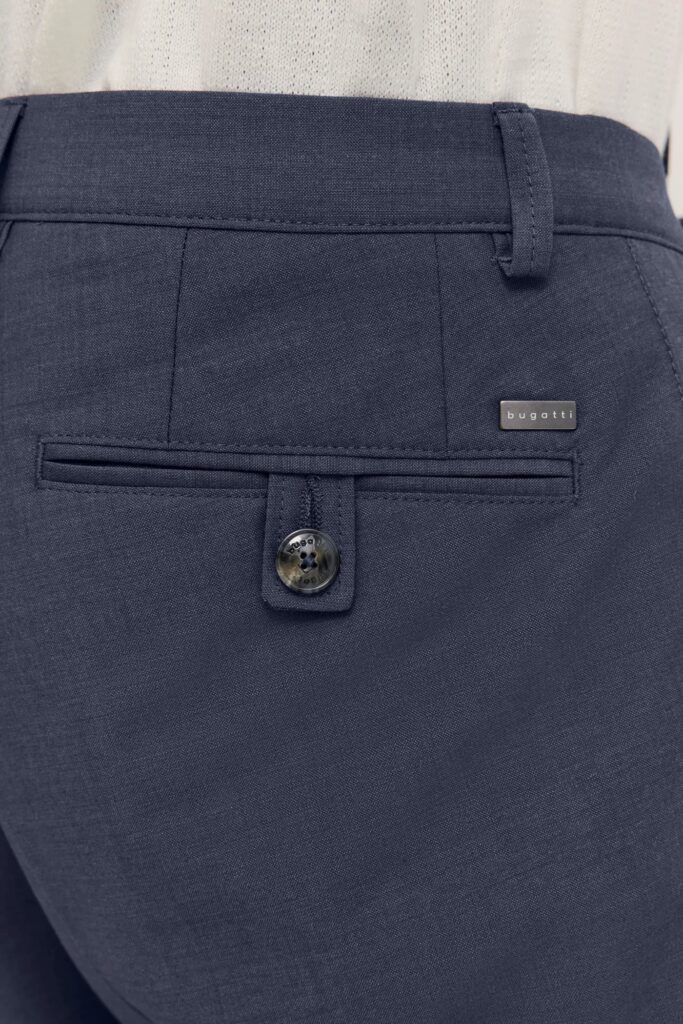 Vācu modes zīmola Bugatti tumši pelēcīgi zilas pakāpeniski sašaurināta piegriezuma bikses vīriešiem. Izgatavotas no viegli elastīga viskozes maisījuma materiāla. Papildinātas ar ielocēm un smalku zīmola logotipa metāla emblēmu pie kabatas mugurpusē.