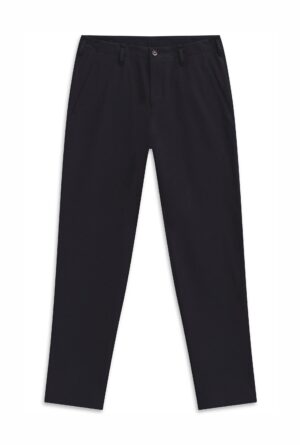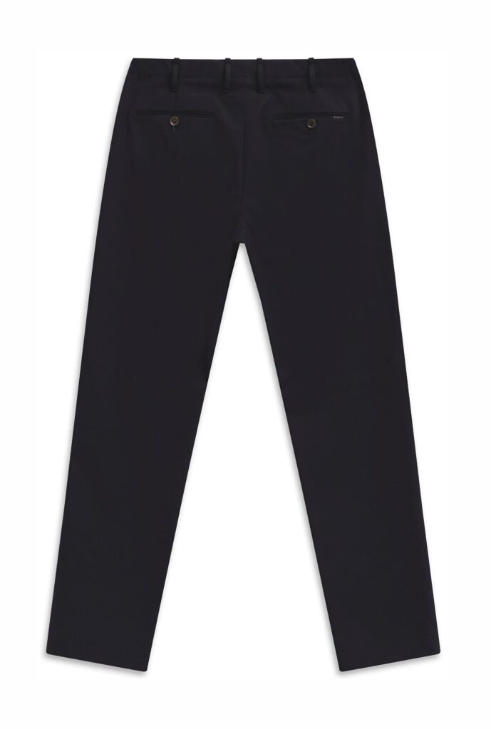 Vācu modes zīmola Bugatti tumši zilas pakāpeniski sašaurināta piegriezuma chino bikses vīriešiem. Izgatavotas no elastīga viskozes maisījuma materiāla. Papildinātas ar smalku zīmola emblēmu pie kabatas mugurpusē.