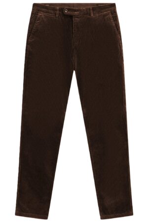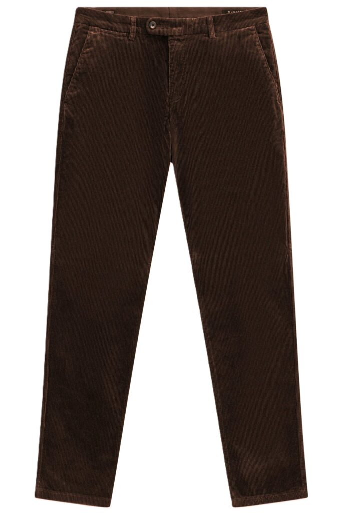 Vācu modes zīmola Bugatti ērtas un komfortablas moderna piegriezuma vīriešu bikses tumšā, šokolādes brūnā krāsā. Izgatavotas no mīksta kokvilnas un liocela velveta. Papildinātas ar piecu kabatu dizainu un smalku zīmola logotipa emblēmu mugurpusē.
