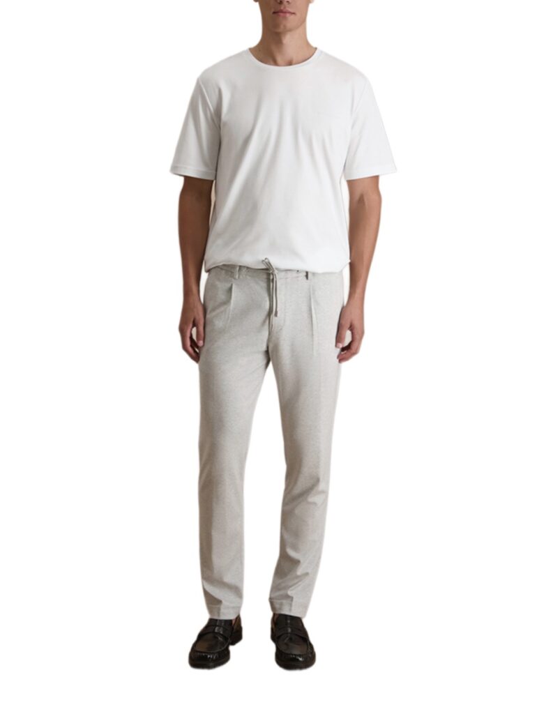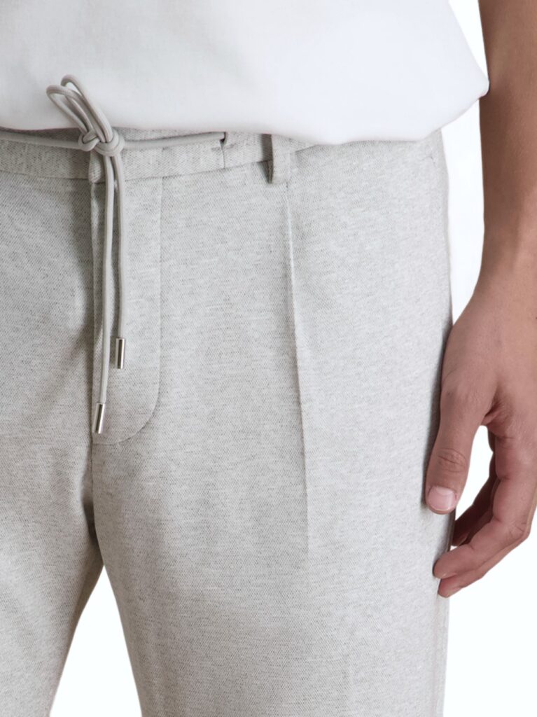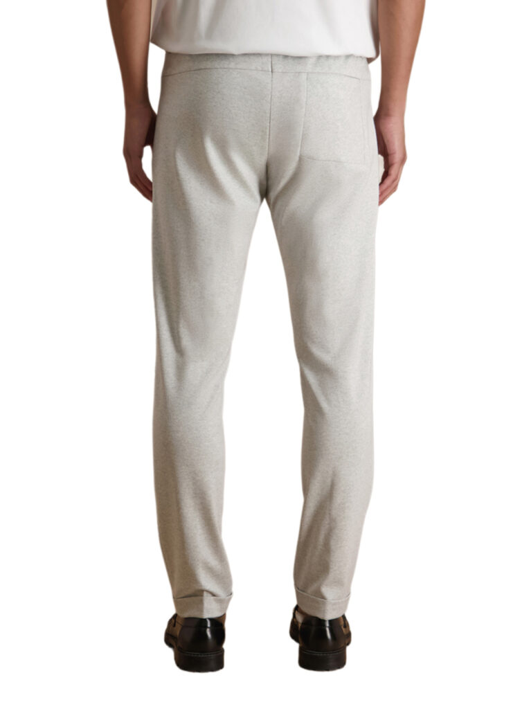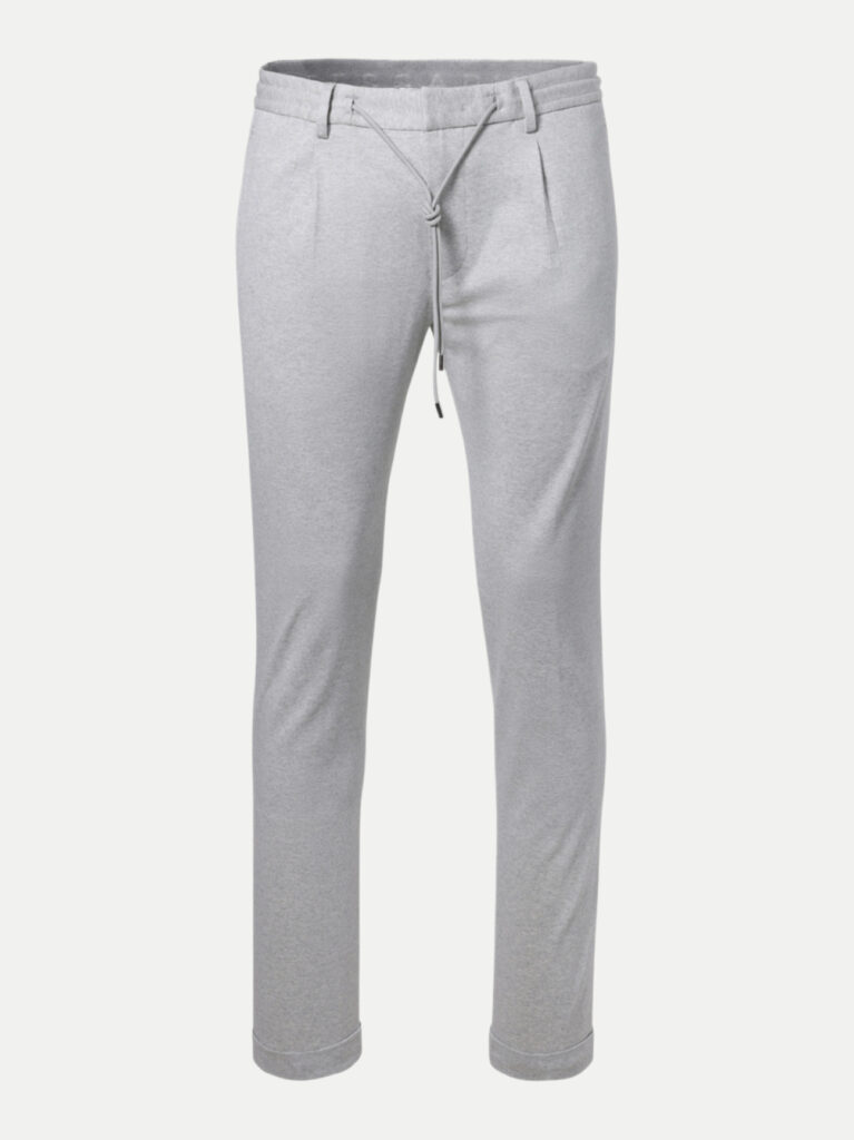 Austriešu premium klases modes zīmola Baldessarini gaiši pelēkas vīriešu bikses ar elastīgu, sasienamu jostasvietu. Izgatavotas no Itālijā ražota augstākās kvalitātes viskozes maisījuma melanža materiāla. Papildinātas ar fiksētiem apakšmalu atlokiem.