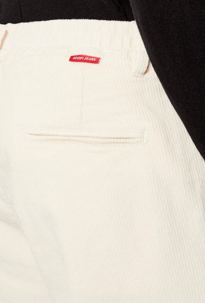 Vācu modes zīmola Joop! komfortablas brīva piegriezuma vīriešu bikses gaiši bēšā krāsā. Izgatavotas no viegli elastīga kokvilnas velveta auduma. Papildinātas ar ielocēm un mugurpusē elastīgu jostasvietu. Akcentētas ar košām zīmola Joop Jeans! logo detaļām.