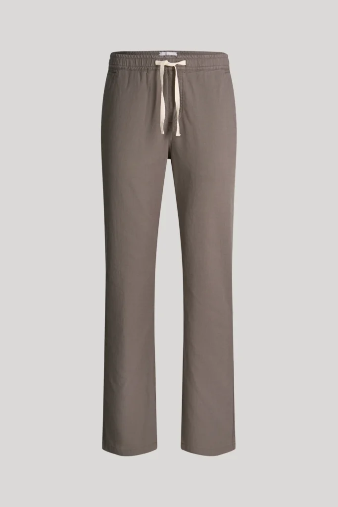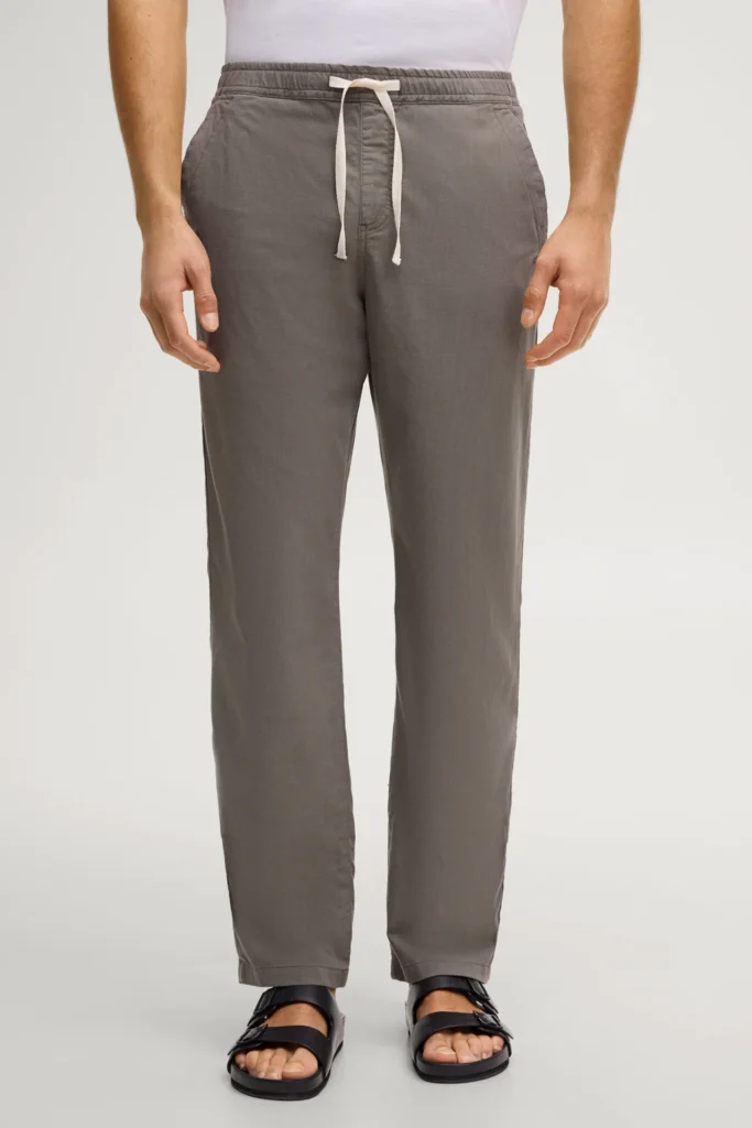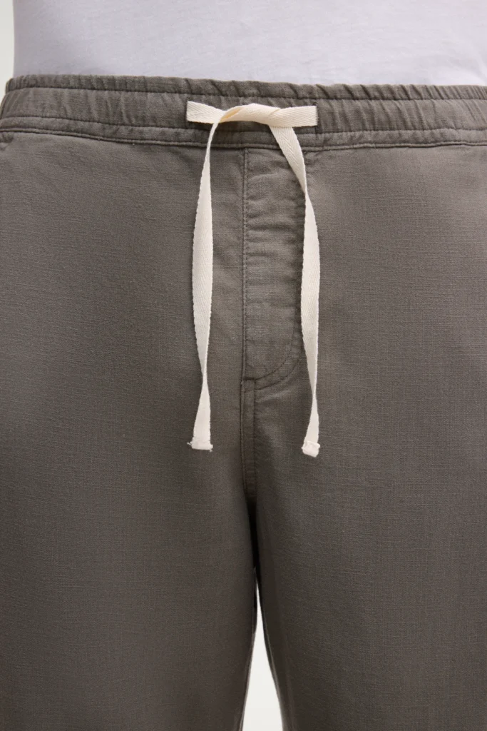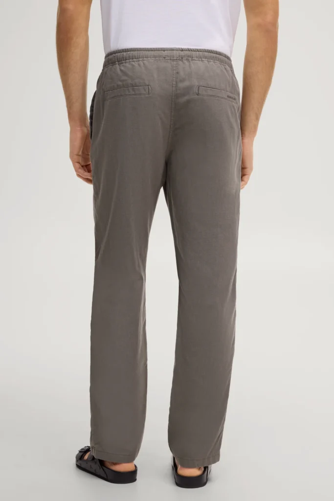 Vācu modes zīmola Joop! vīriešu bikses ar elastīgu sasienamo jostasvietu tumši zaļganpelēkā haki tonī. Izgatavotas no viegla liocela un kokvilnas materiāla. Papildinātas ar rāvējslēdzēja aizdares kabatu sānu vīlē un smalku vientoņa logo izšuvumu uz kabatas mugurpusē.