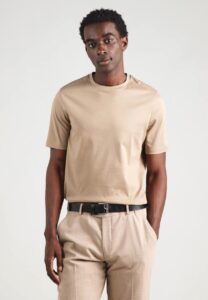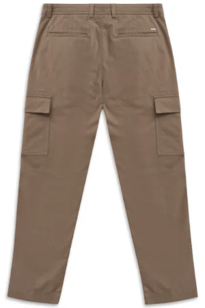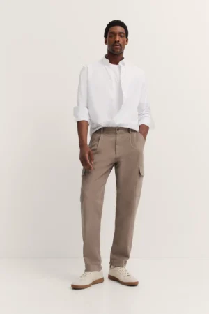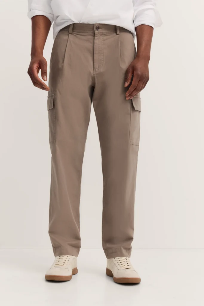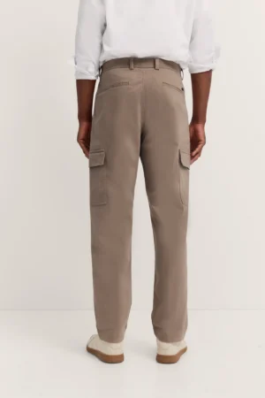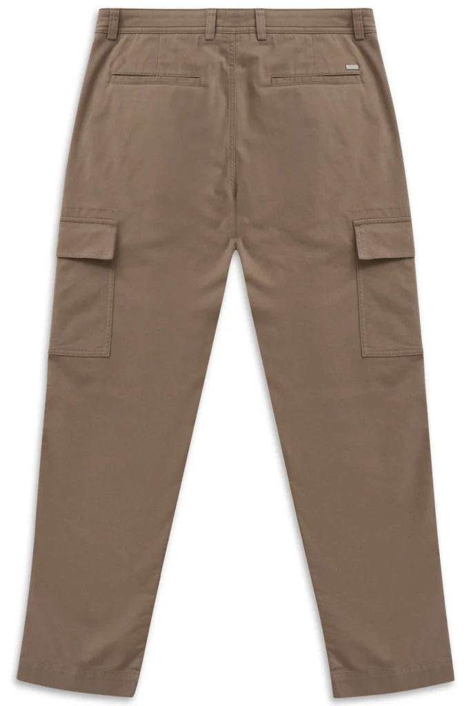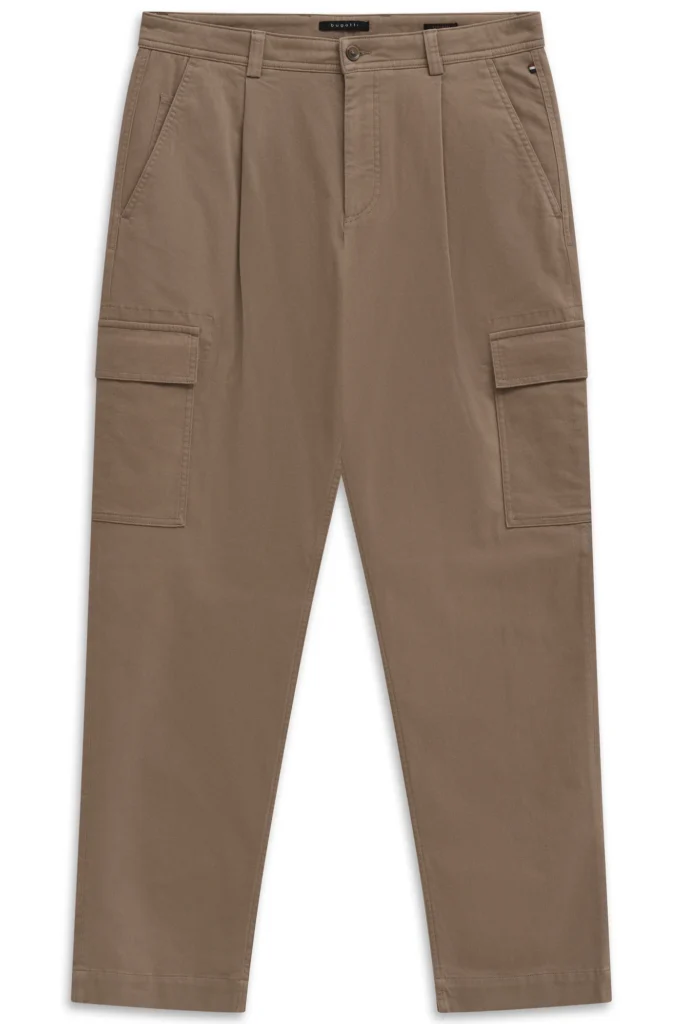 Vācu modes zīmola Bugatti tumši bēšas pakāpeniski sašaurināta piegriezuma vīriešu cargo stila bikses ar uzšūtām augšstilbu kabatām. Izgatavotas blīva un mīksta viegli elastīgas kokvilnas materiāla. Papildinātas ar nelielām ielocēm pie jostas un smalkīem zīmola logotipa akcentiem.