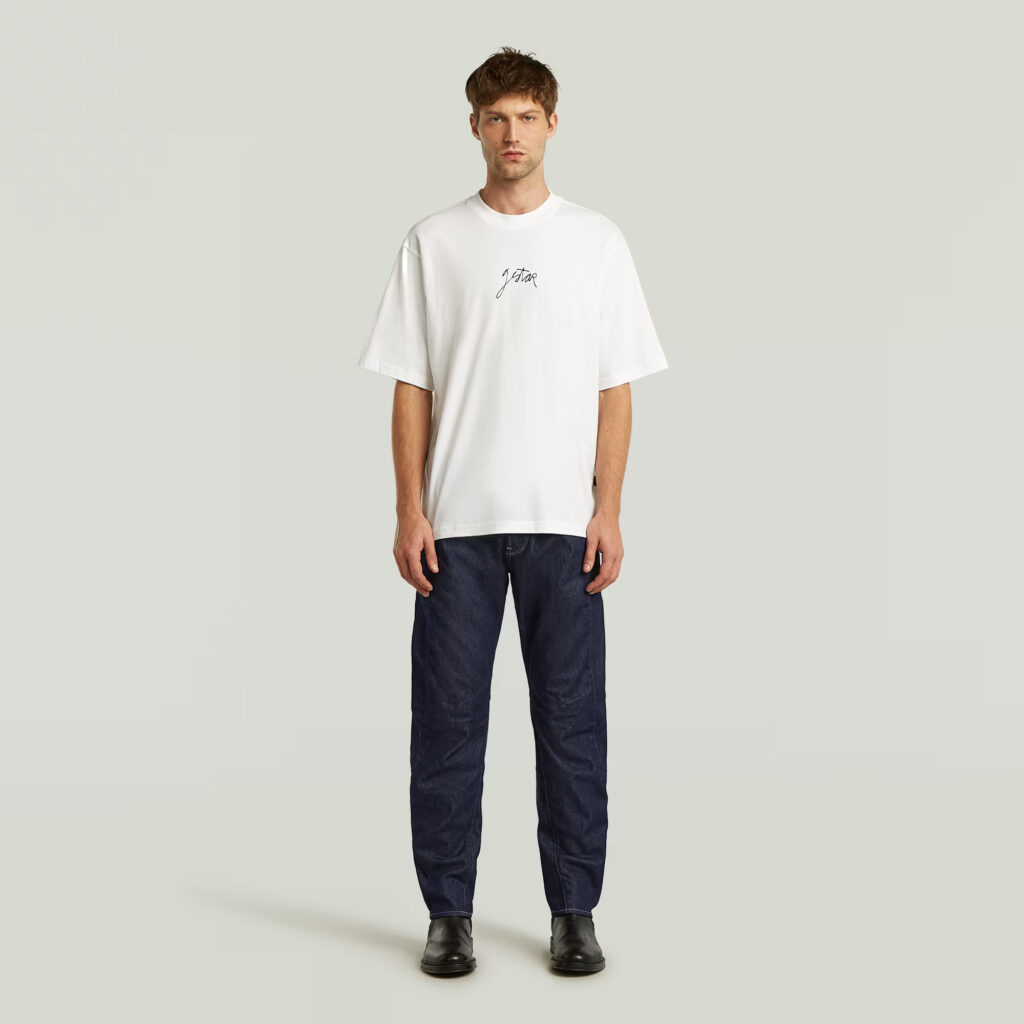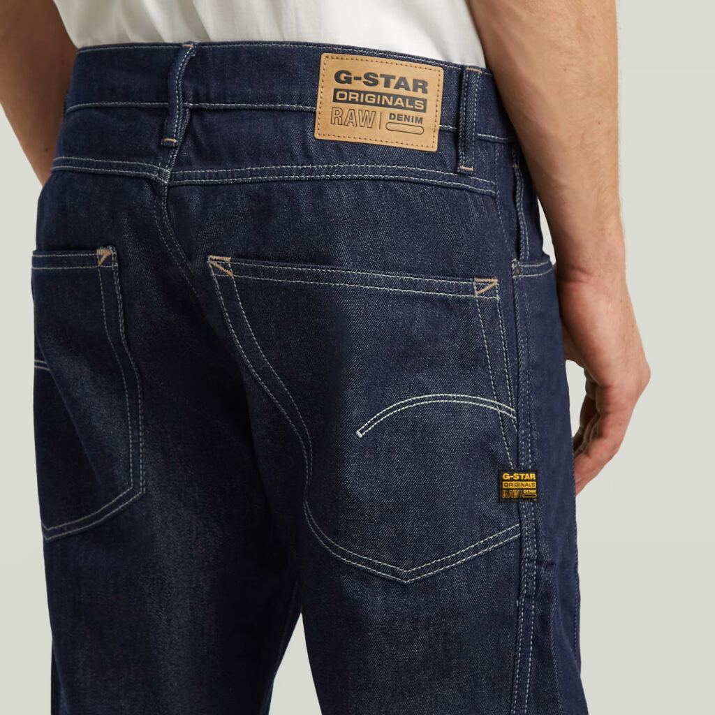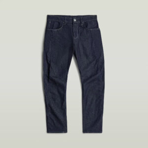 Nīderlandes zīmola G-Star Raw tumši zili viegli pieguļoša 3D piegriezuma vīriešu džinsi ar kontrastējošām dekoratīvajām nošuvēm. Izgatavoti no atjaunojamas un pārstrādātas kokvilnas. Papildināti ar pogu aizdari un zīmola logotipa akcentiem.