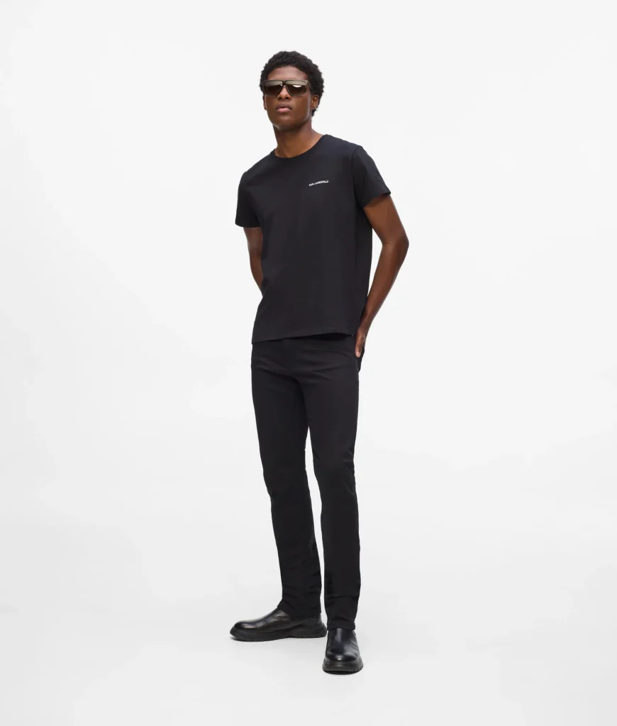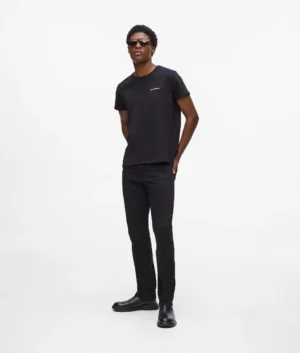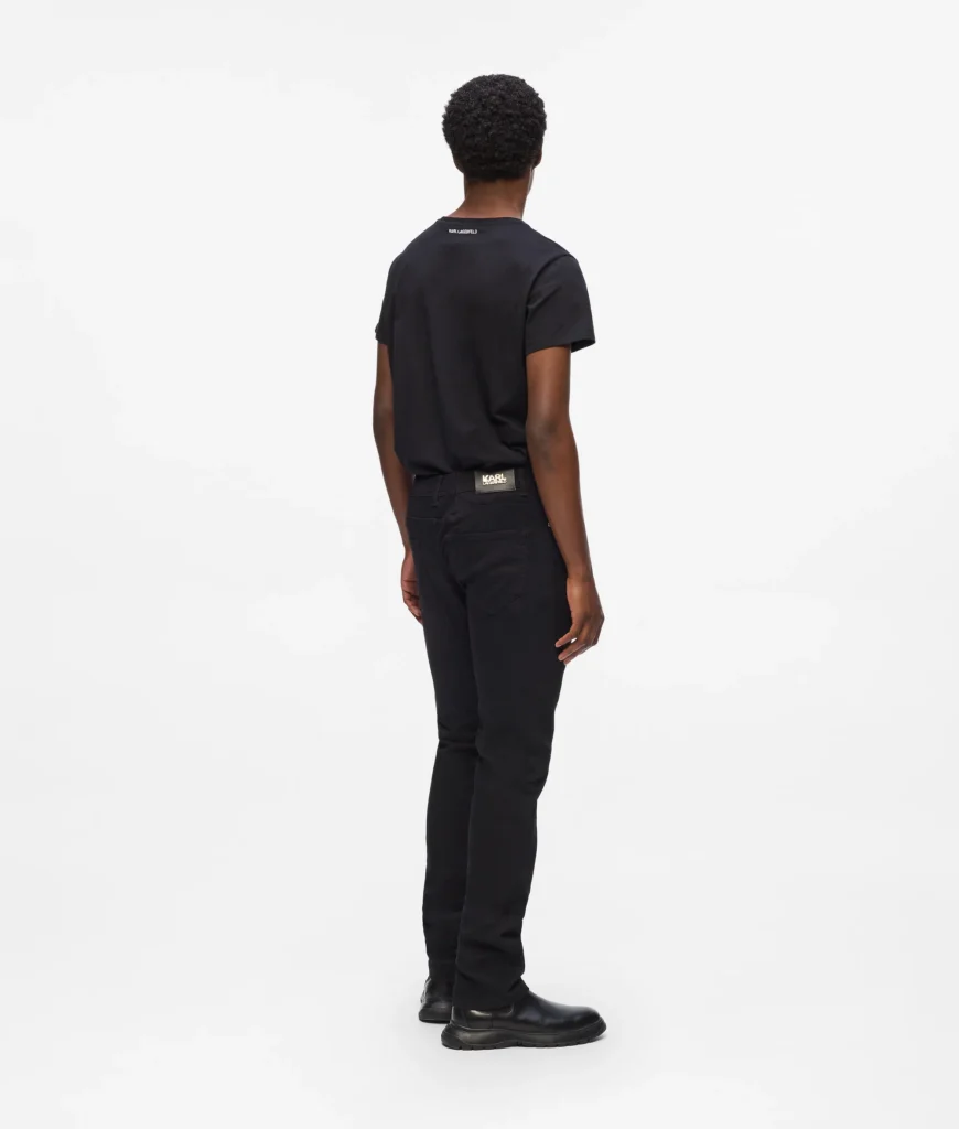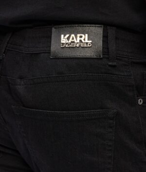 Vācu luksusa zīmola Karl Lagerfeld melni klasiska dizaina vīriešu džinsi ar sudraba krāsas metāla un zīmola logotipa detaļām. Izgatavoti no elastīgas kokvilnas. Akcentēti ar logo emblēmu mugurpusē.