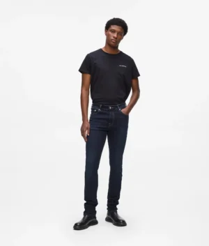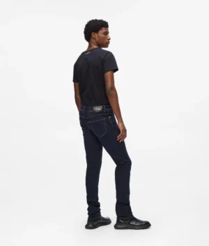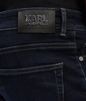 Vācu luksusa zīmola Karl Lagerfeld tumši zili klasiska dizaina vīriešu džinsi ar sudraba krāsas metāla un zīmola logotipa detaļām. Izgatavoti no elastīgas kokvilnas. Akcentēti ar kontrastējošām nošuvēm un logo emblēmu mugurpusē.