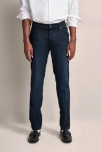 Vācu modes zīmola Bugatti zili, pakāpeniski sašaurināta piegriezuma džinsi vīriešiem. Izgatavoti no Itālijā ražota elastīga kokvilnas un liocela materiāla ar nodiluma efektu. Papildināti ar vara krāsas metāla detaļām un rokām darinātu zīmola logotipa zamša emblēmu mugurpusē.