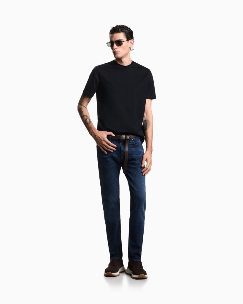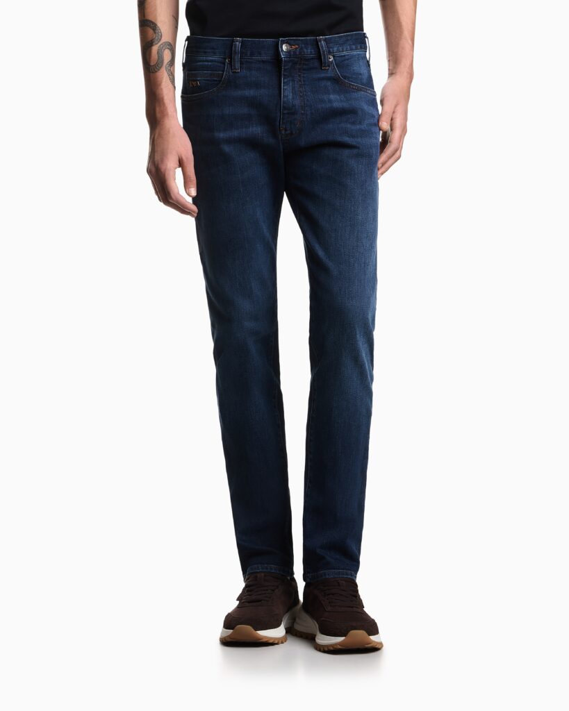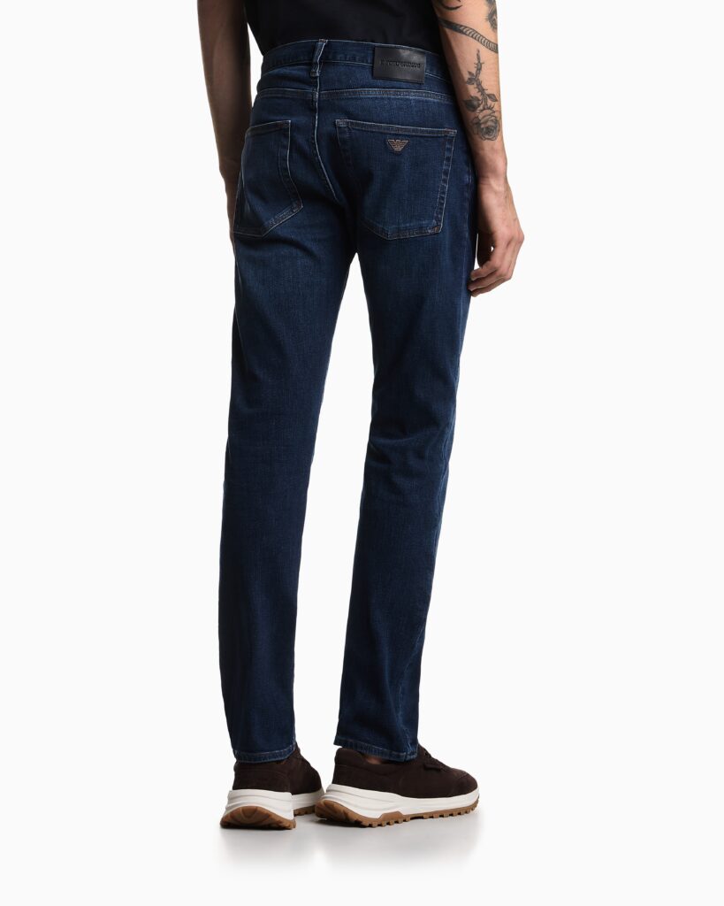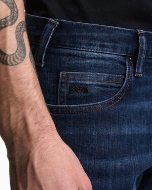 Itāļu luksusa zīmola Emporio Armani standarta piegriezuma vīriešu džinsi tumši zilā krāsā ar nobružājuma efektu no Essentials kolekcijas. Izgatavoti no viegli elastīgas kokvilnas. Akcentēti ar kontrastējošām nošuvēm, ērgļa logotipu un zīmola ādas emblēmu mugurpusē.