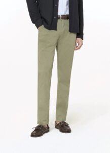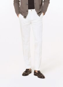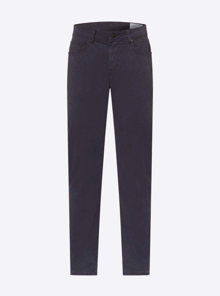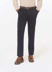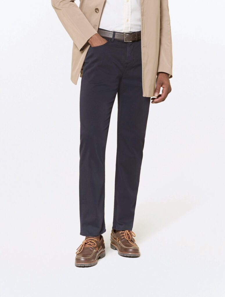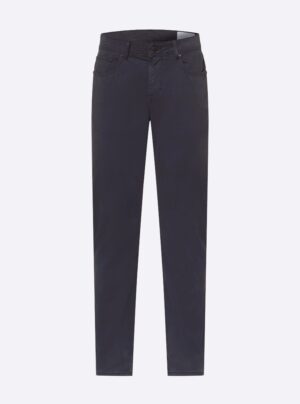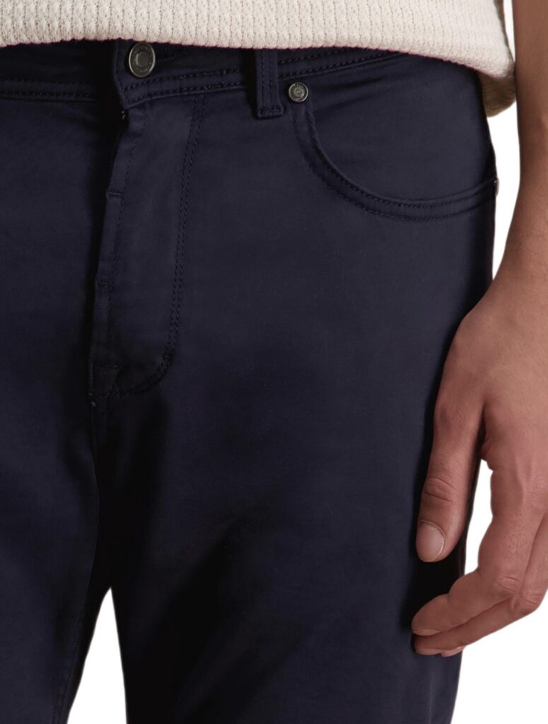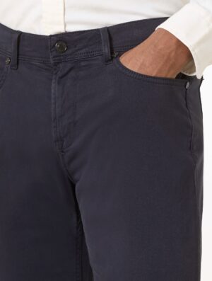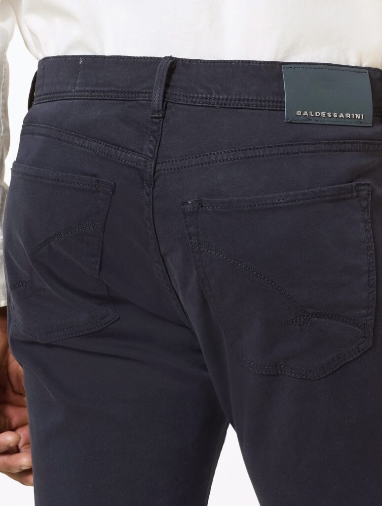 Austriešu premium klases modes zīmola Baldessarini komfortablas džinsu stila chino bikses tumšā, nakts zilā tonī. Izgatavotas no viegli kopjama, mīksta un elastīga soft touch kokvilnas materiāla. Papildinātas ar dekoratīvām nošuvēm un piecu kabatu dizainu. Akcentētas ar metāla detaļām un zīmola emblēmu mugurpusē.