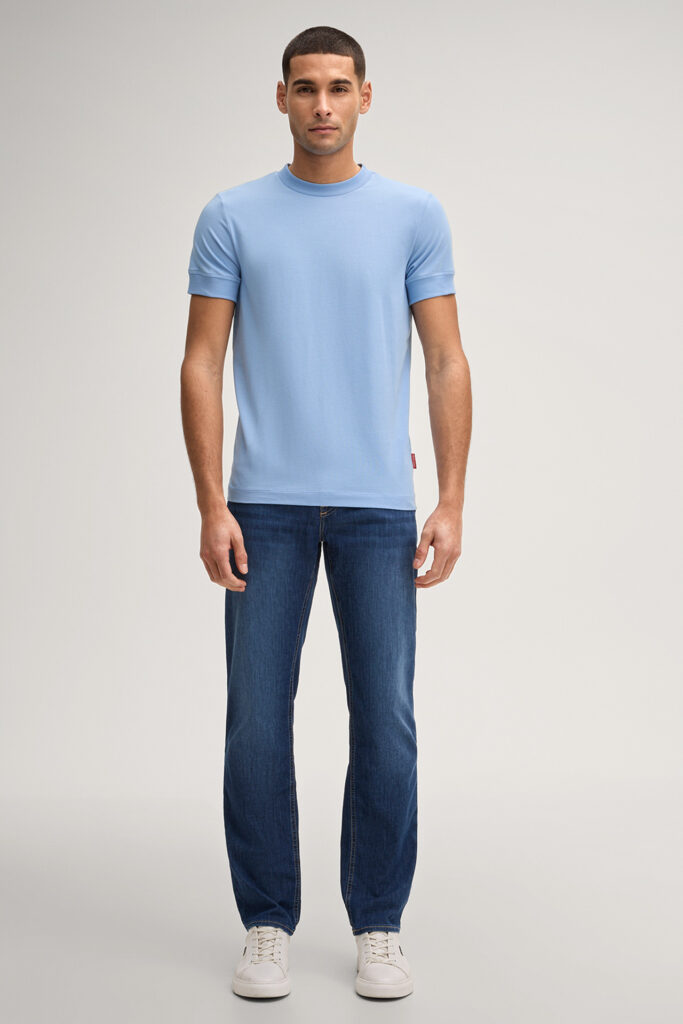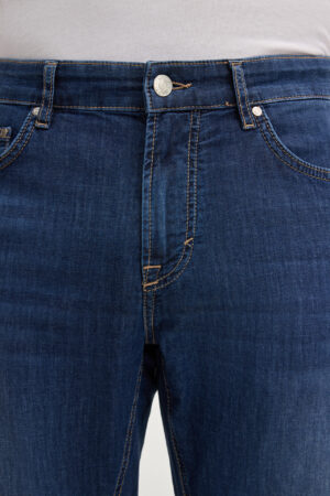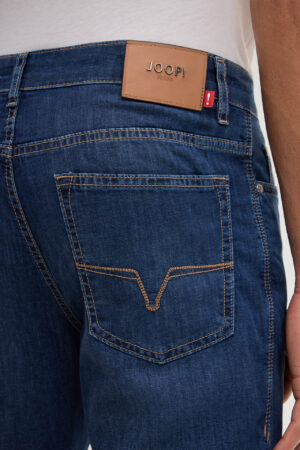 Vācu modes zīmola Joop! tumši zili moderna piegriezuma vīriešu džinsi ar viegla nobružājuma efektu. Izgatavoti no plāna un elastīga kokvilnas maisījuma materiāla. Papildināti ar kontrastējošām nošuvēm un zīmola Joop Jeans! logo detaļām.