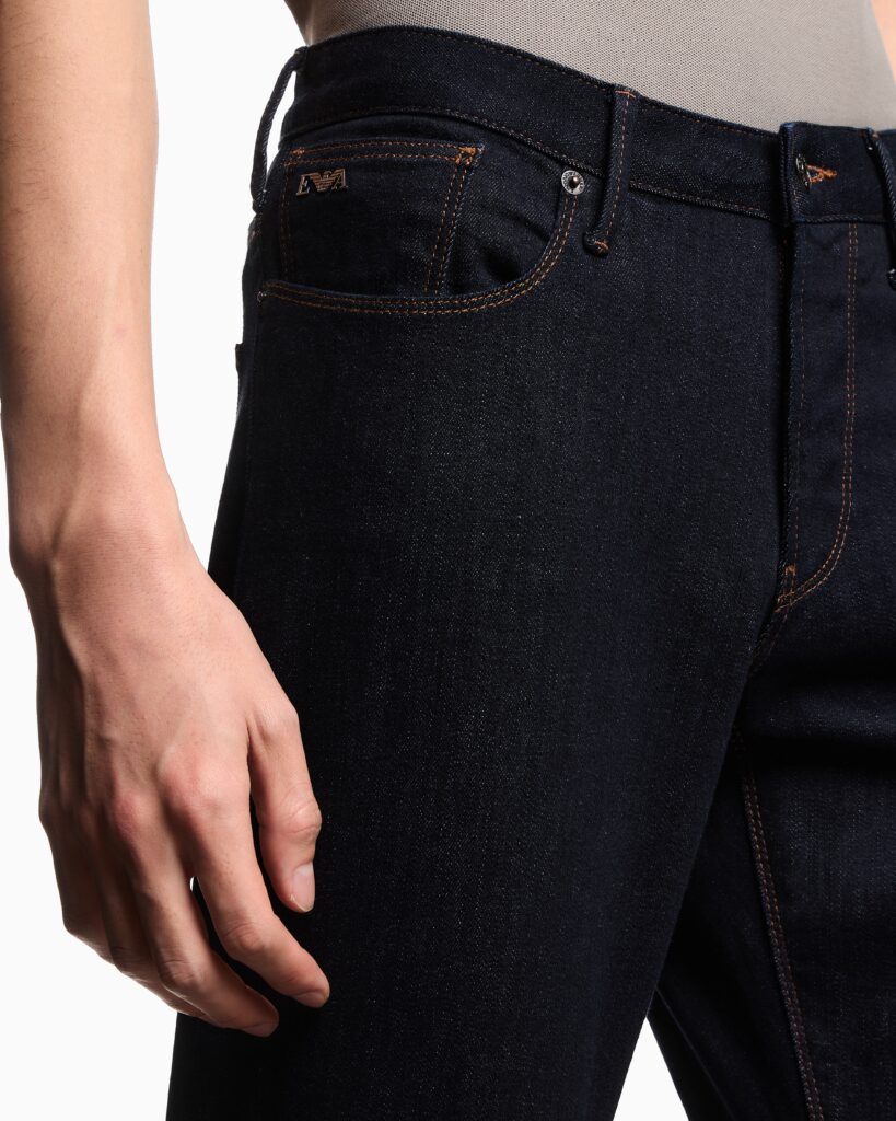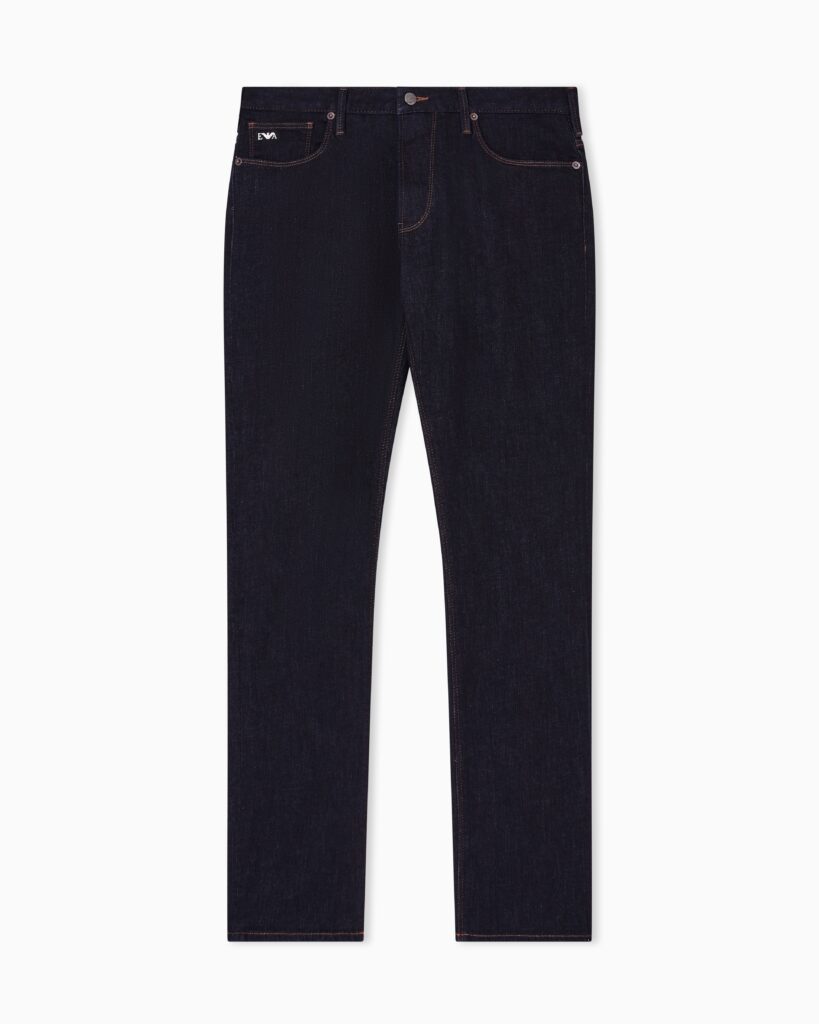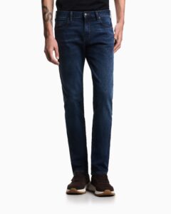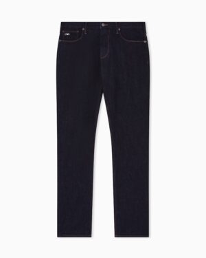 Itāļu luksusa zīmola Emporio Armani viegli pieguļoši Essentials kolekcijas vīriešu džinsi tumši zilā krāsā. Izgatavoti no viegli elastīgas kokvilnas. Akcentēti ar kontrastējošām nošuvēm, ērgļa logotipu un zīmola ādas emblēmu mugurpusē.