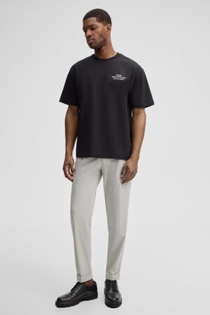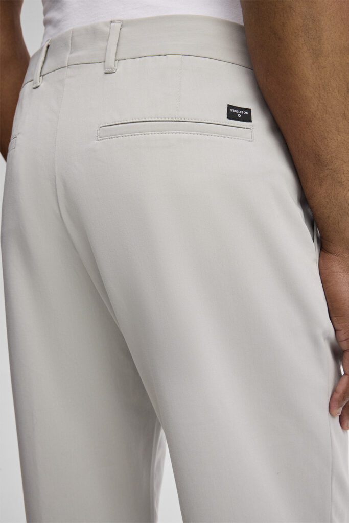 Šveices modes zīmola Strellson stilīgas sašaurināta piegriezuma vīriešu bikses gaiši pelēkā krāsā. Izgatavotas no viegla un elastīga viskozes maisījuma materiāla. Papildinātas ar ielocēm un fiksētiem apakšmalu atlokiem. Akcentētas ar smalkām zīmola logotipa detaļām.