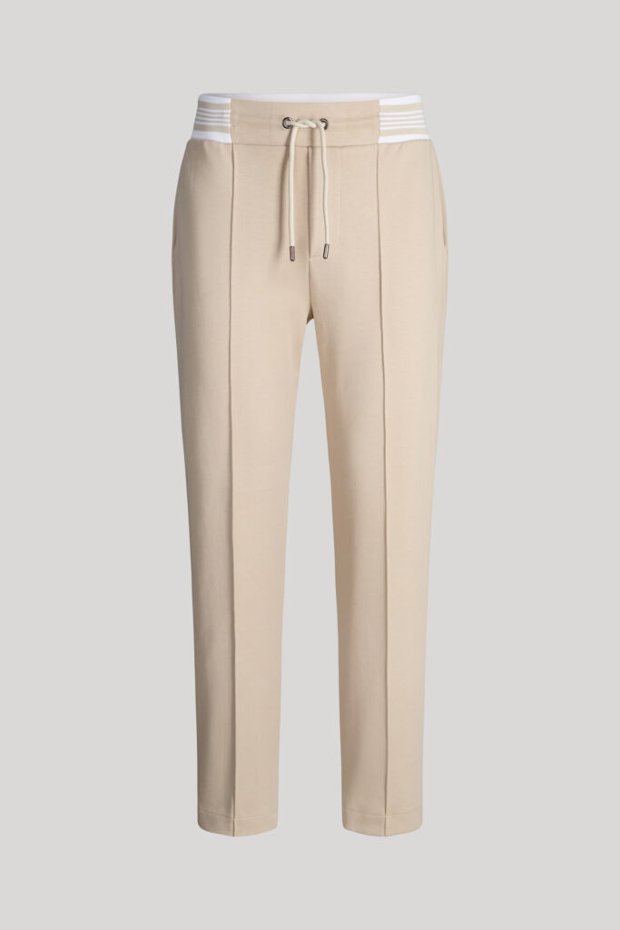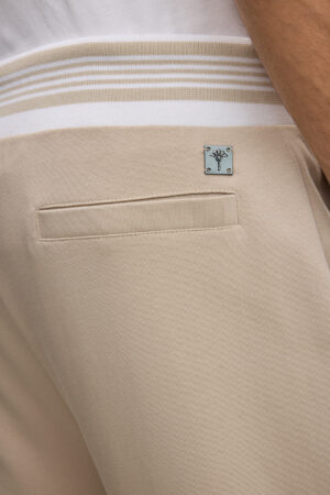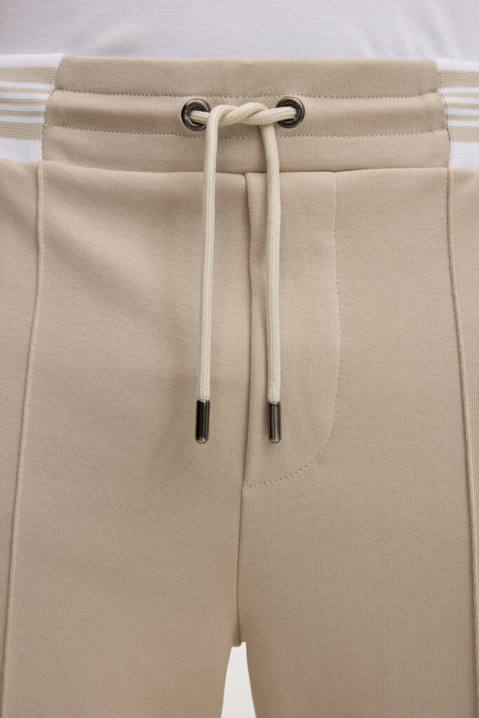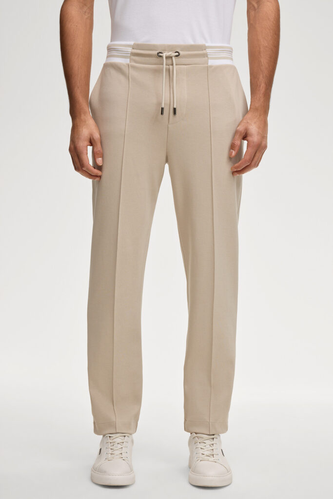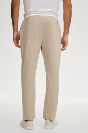 Vācu modes zīmola Joop! pelēcīgi bēšas vīrīešu sportiskā stila bikses ar elastīgu sasienamo jostasvietu. Izgatavotas no komfortabla 100% kokvilnas materiāla. Papildinātas ar vertikālām nošuvēm. Akcentētas ar baltu svītru rakstu jostasvietā un smalku zīmola metāla emblēmu pie kabatas mugurpusē.
