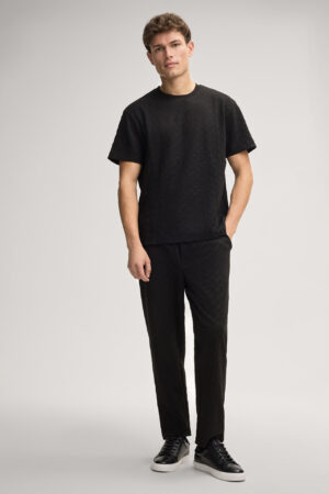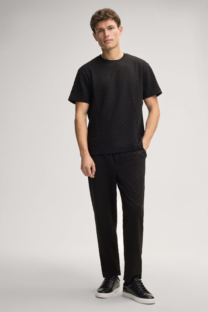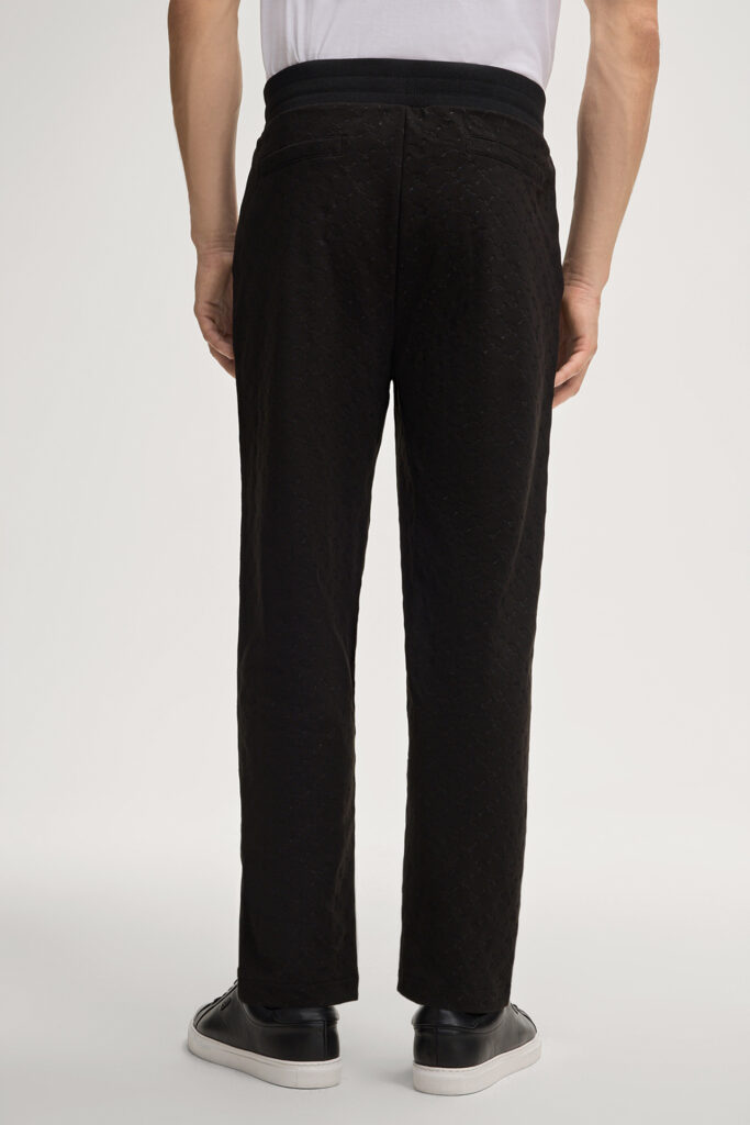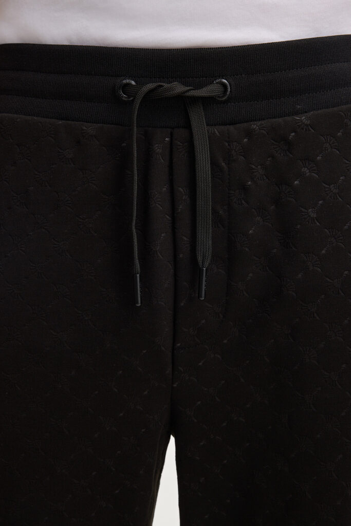 Vācu modes zīmola Joop! vīriešu sportiskā stila bikses melnā krāsā. Izgatavotas no blīva viskozes maisījuma materiāla ar grafisku rudzupuķu rakstu. Papildinātas ar elastīgu sasienamo jostasvietu un zīmola logotipa detaļām.