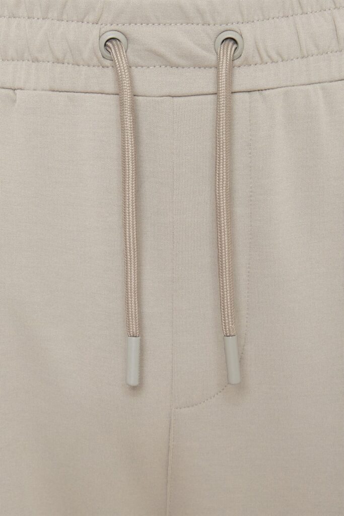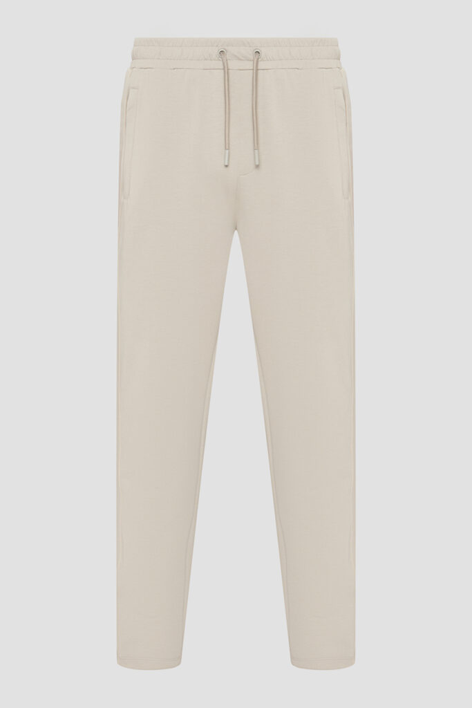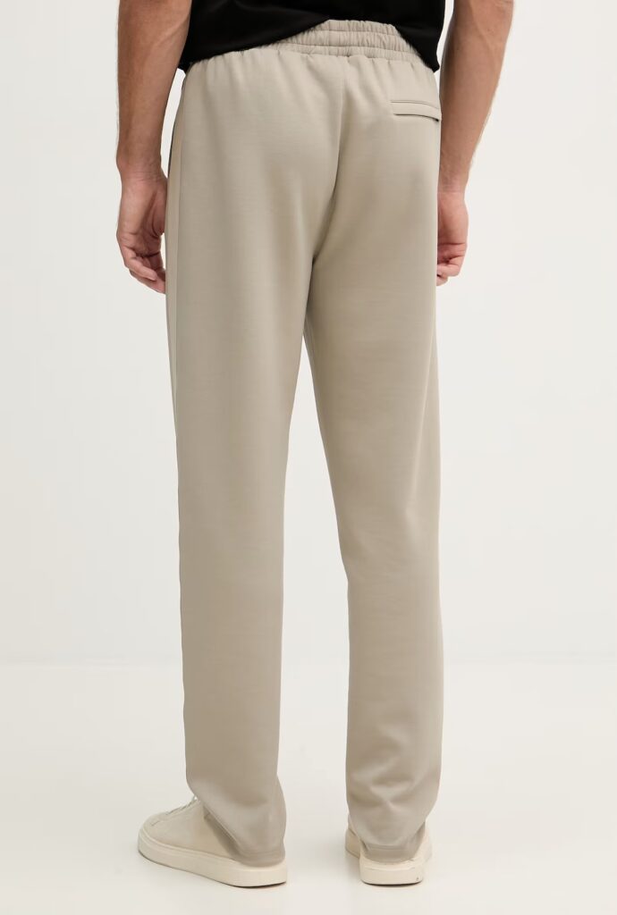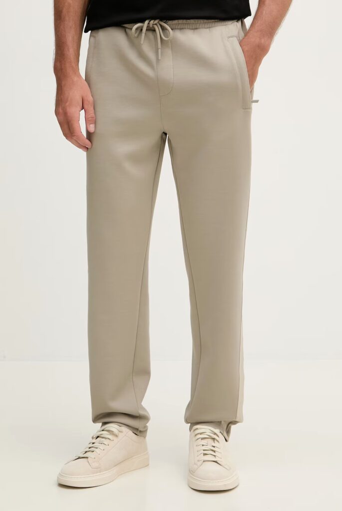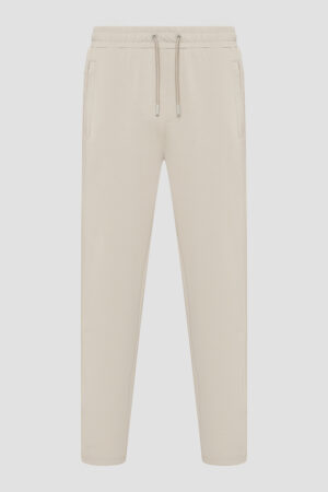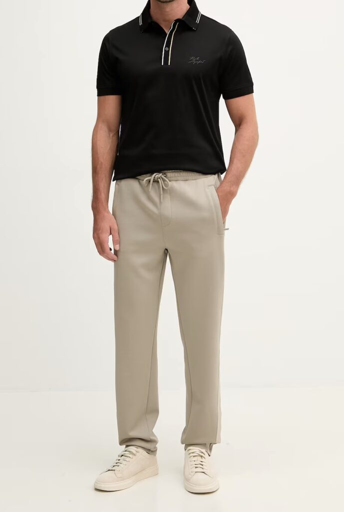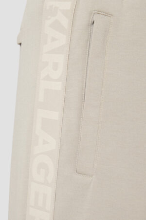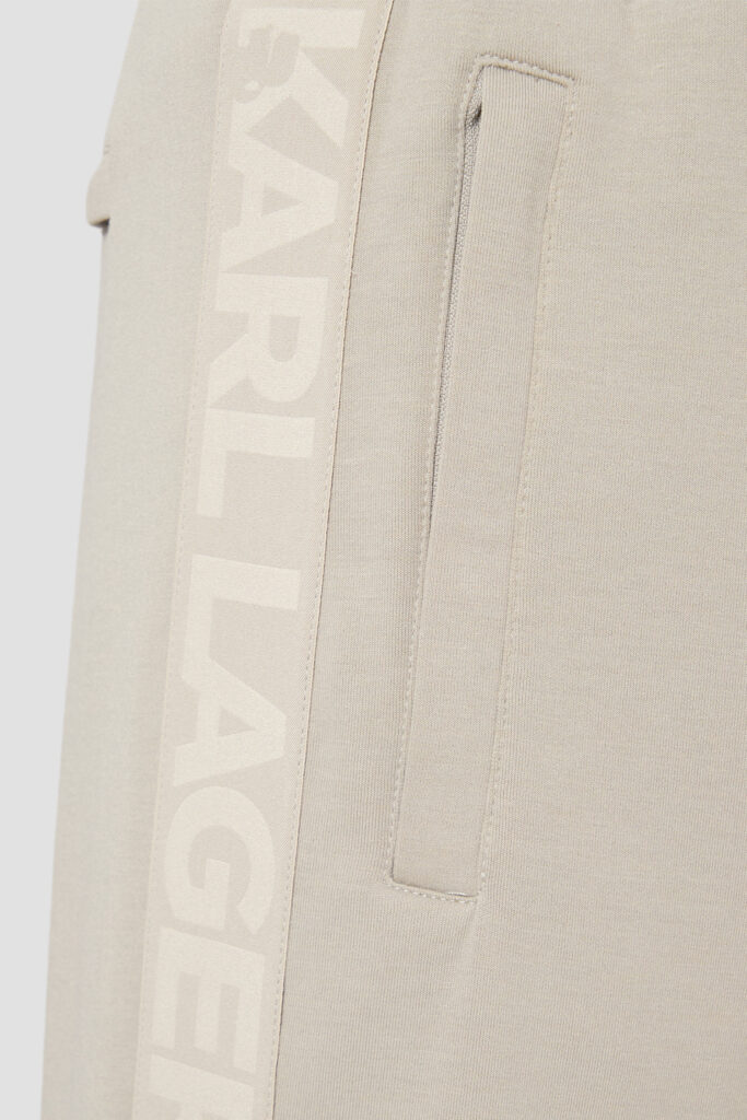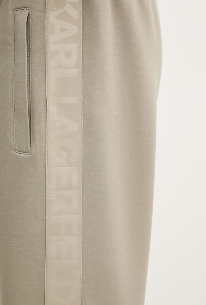 Vācu luksusa zīmola Karl Lagerfeld pelēcīgi bēšas vīriešu sportiskā stila bikses ar elastīgu sasienamo jostu. Izgatavotas no mīksta un elastīga viskozes maisījuma materiāla, papildinātas ar rāvējslēdzēju aizdares kabatām. Akcentētas ar izteiksmīgu vientoņa logo lenti sānos.