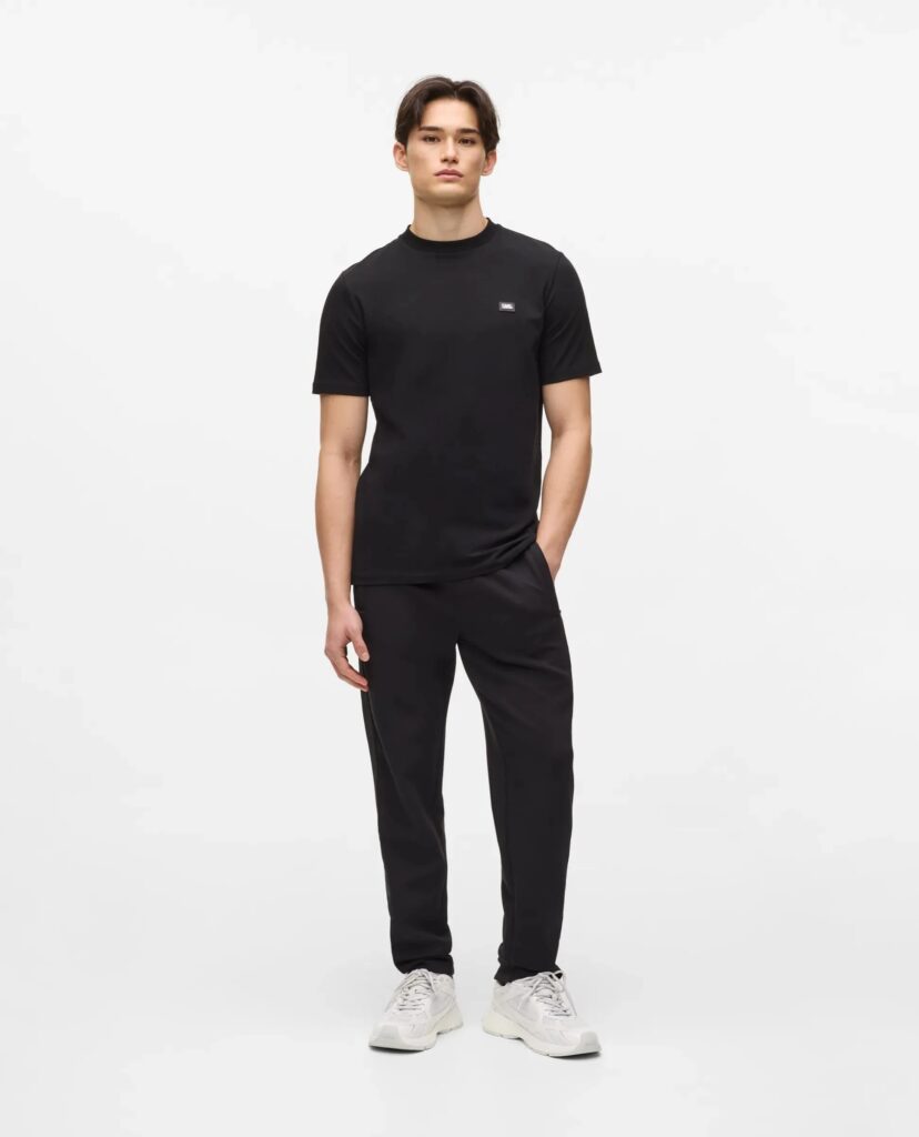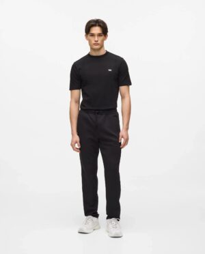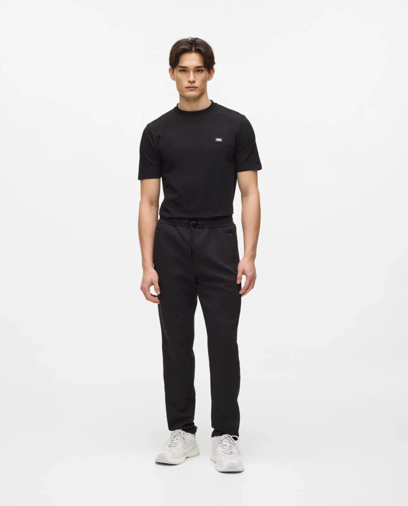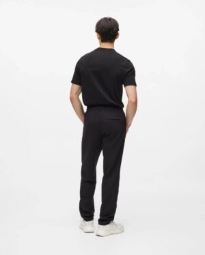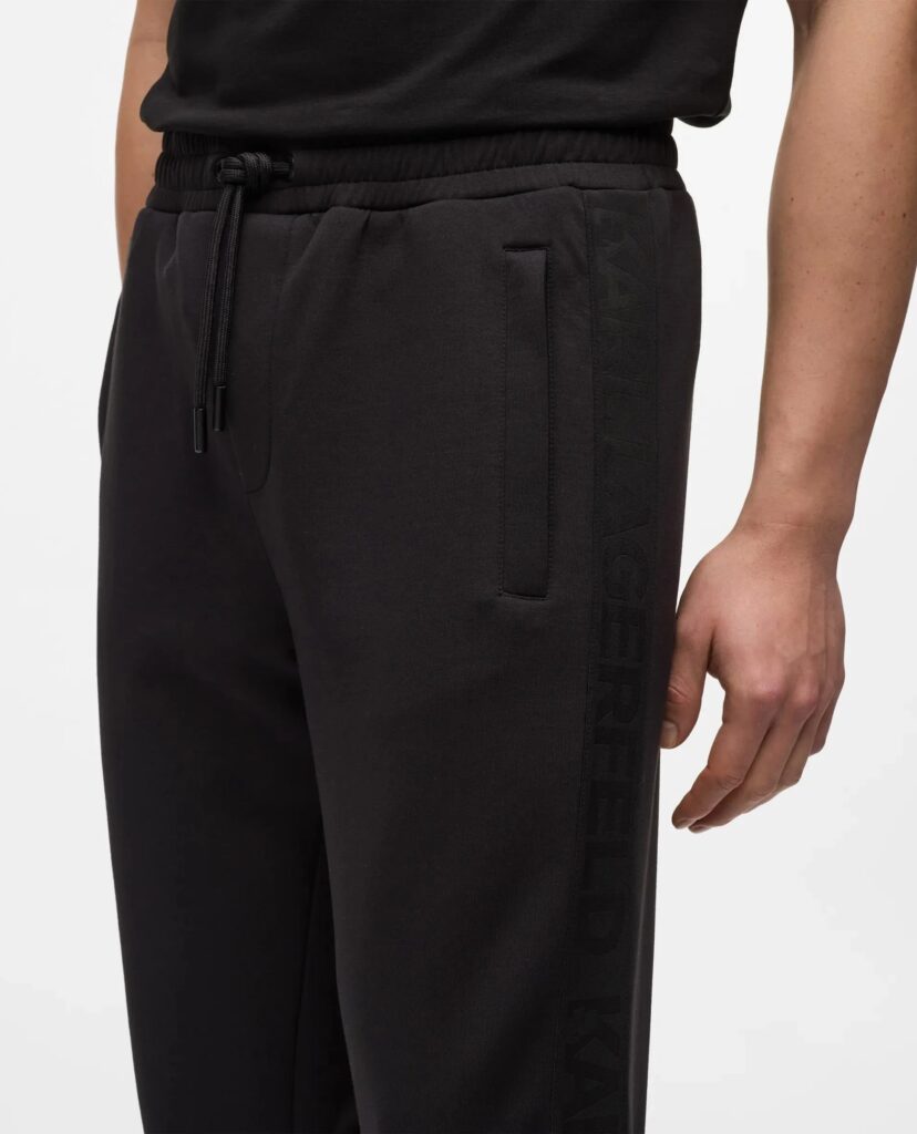 Vācu luksusa zīmola Karl Lagerfeld melnas vīriešu sportiskā stila bikses ar elastīgu sasienamo jostu. Izgatavotas no mīksta un elastīga viskozes maisījuma materiāla, papildinātas ar rāvējslēdzēju aizdarers kabatām. Akcentētas ar izteiksmīgu vientoņa logo lenti sānos.