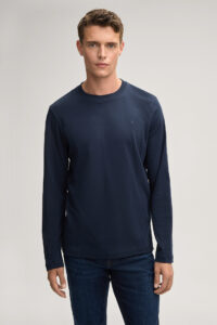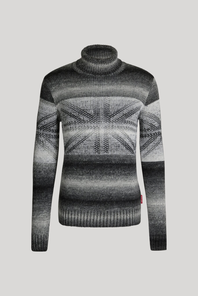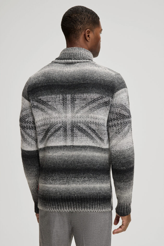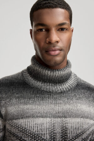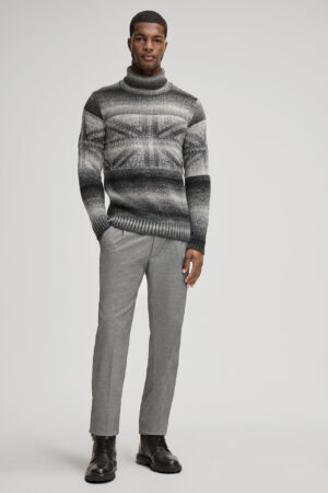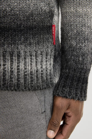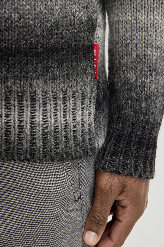 Vācu modes zīmola Joop! adīts vīriešu džemperis ar teksturētu dizaina rakstu melni pelēkā krāsu pārejā. Izgatavots no siltas vilnas maisījuma dzijas. Papildināts ar rievotu apdari un kontrastējošu Joop! Jeans zīmola emblēmu sānu vīlē.
