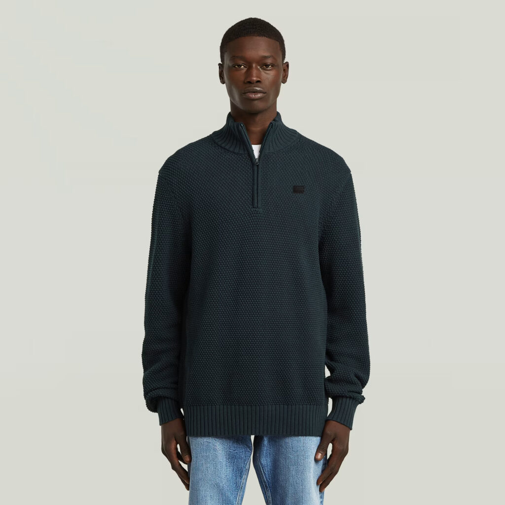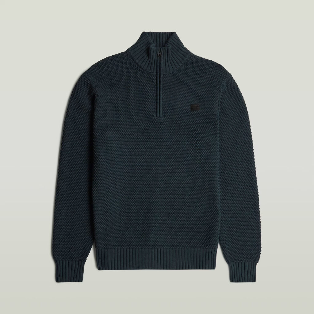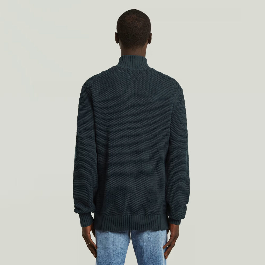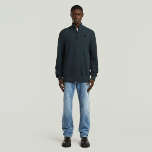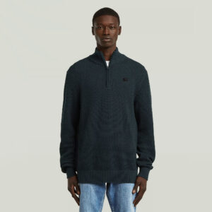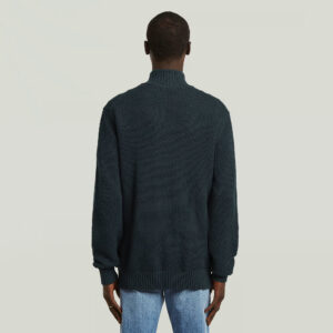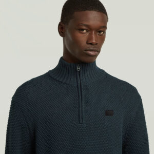 Nīderlandes zīmola G-Star Raw tumši zils vīriešu džemperis ar paaugstinātu apkakli un rāvējslēdzēja aizdari. Izgatavots no 100% organiskās kokvilnas ar teksturētu adījuma rakstu. Papildināts ar rievotu apdari un zīmola emblēmas akcentu.