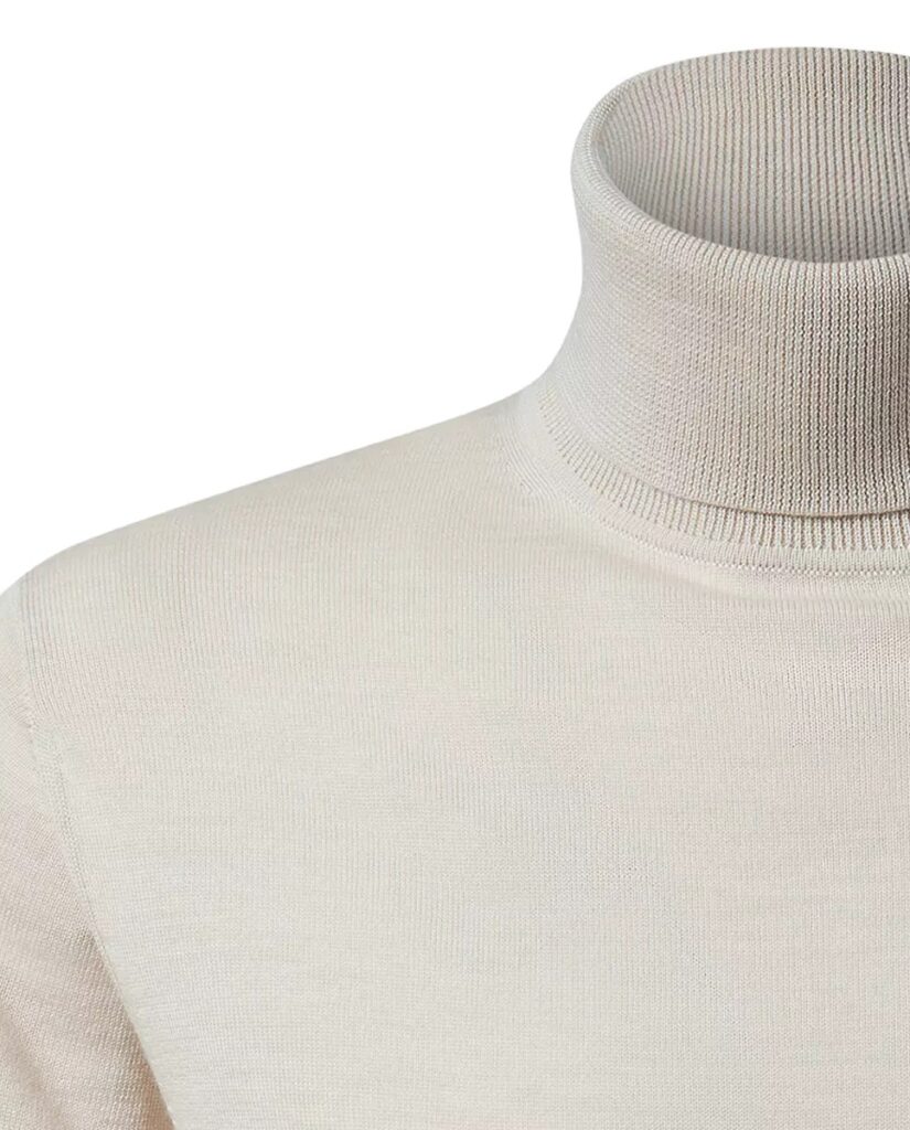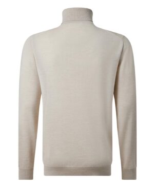 Austriešu premium klases modes zīmola Baldessarini smalka adījuma vīriešu džemperis gaiši pelēcīgi bēšā krāsā ar augstu atlokāmo apkakli. Izgatavots no plānas un mīkstas jaunvilnas dzijas. Papildināts ar smalki rievotu apdari.