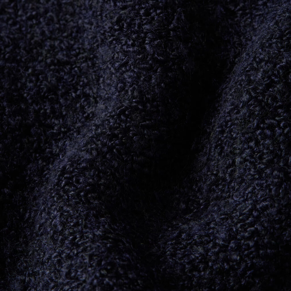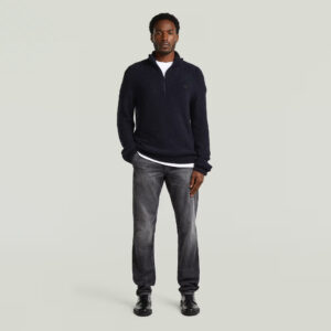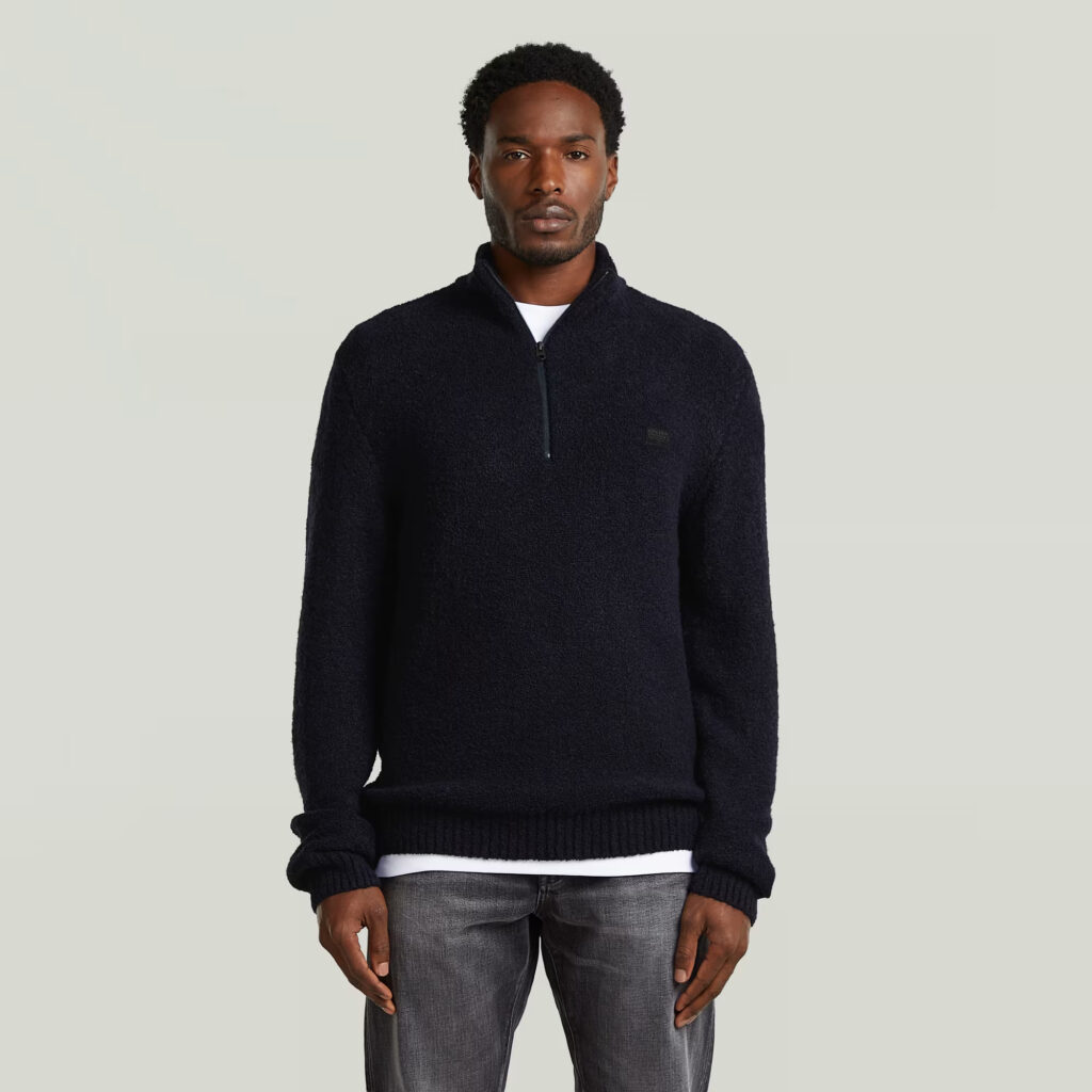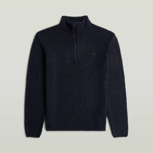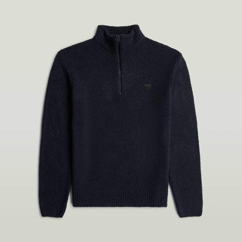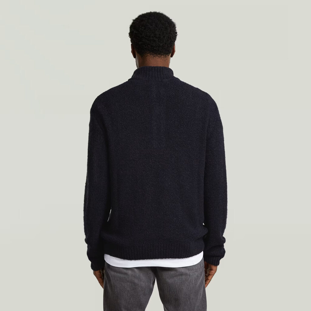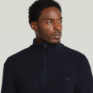 Nīderlandes zīmola G-Star Raw tumši zils vīriešu džemperis ar paaugstinātu apkakli un rāvējslēdzēja aizdari. Izgatavots no biezas buklē tekstūras dzijas. Papildināts ar rievotu apdari un zīmola emblēmas akcentu.