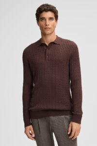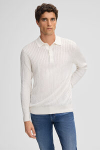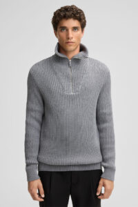 Šveices modes zīmola Strellson mīksts rievota adījuma vīriešu džemperis nakts zilā un gaiši pelēkā toņu pārejā.