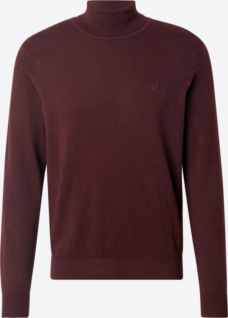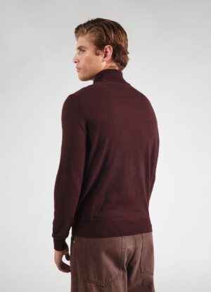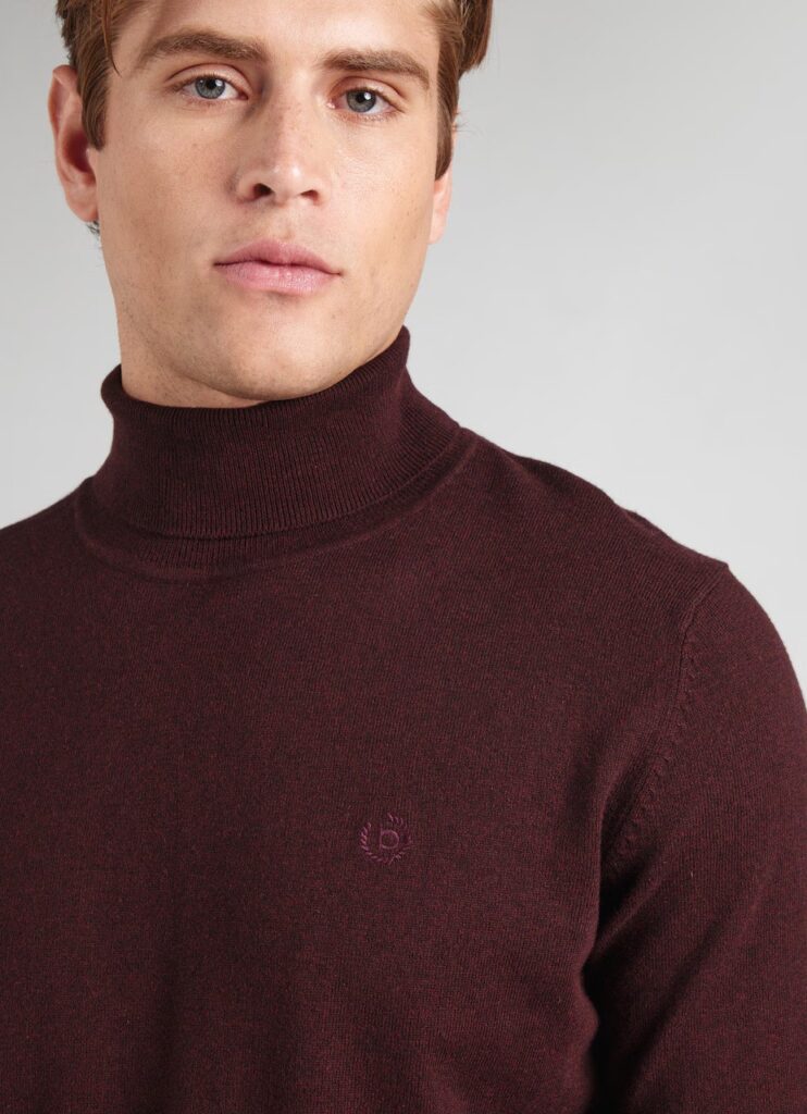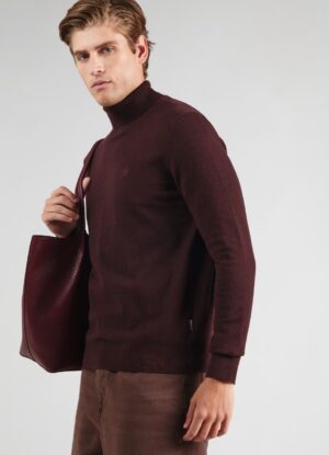 Vācu modes zīmola Bugatti tumši sarkanbrūns smalka adījuma vīriešu džemperis ar augstu atlokāmo apkakli. Izgatavots no mīkstas kokvilnas un kašmira dzijas. Papildināts ar smalki rievotu apdari un zīmola logotipa vientoņa izšuvumu.