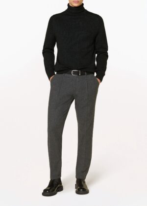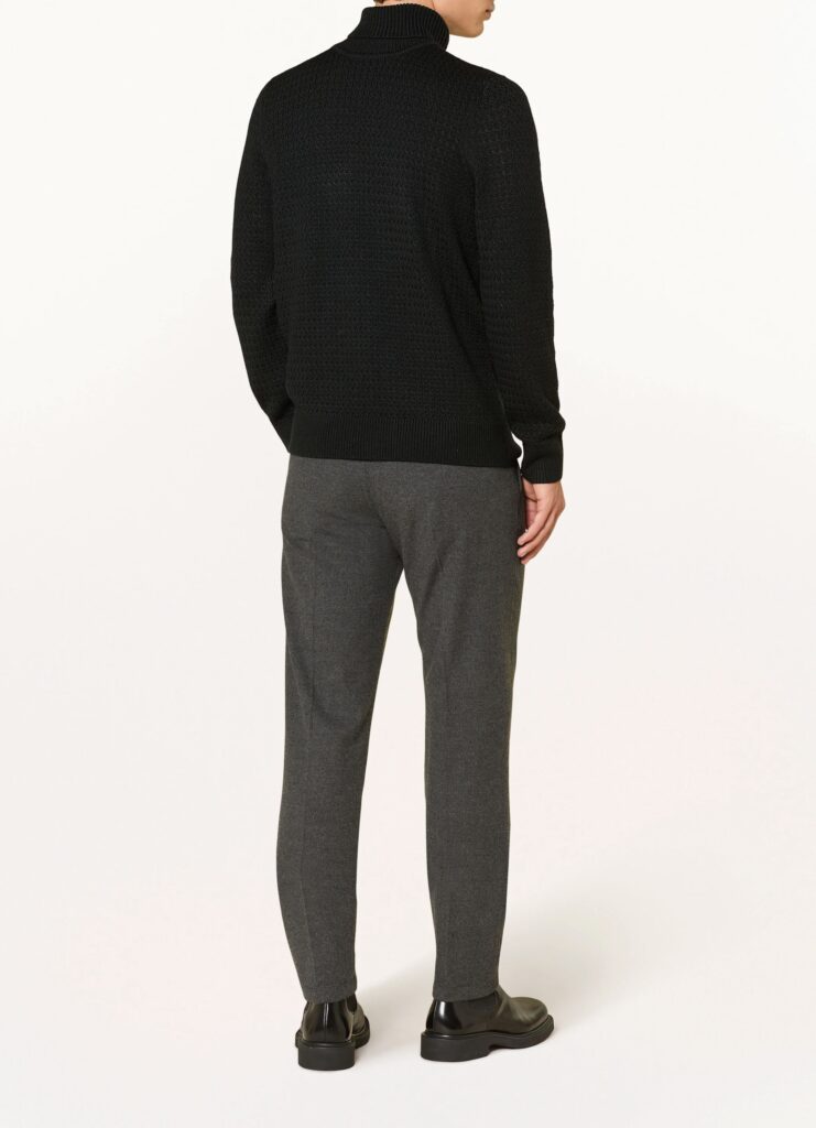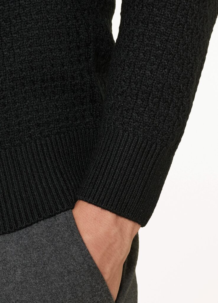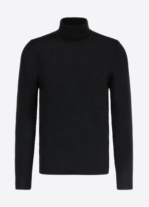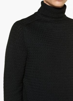 Šveices modes zīmola Strellson adīts vīriešu džemperis ar augstu atlokāmo apkakli melnā krāsā. Izgatavots no vilnas un poliakrila dzijas dekoratīvā pīnīšu adījuma rakstā. Papildināts ar rievotu apdari.