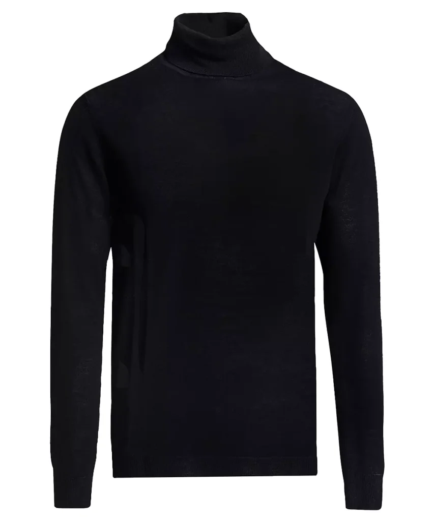 Austriešu premium klases modes zīmola Baldessarini smalka adījuma vīriešu džemperis melnā krāsā ar augstu atlokāmo apkakli. Izgatavots no plānas un mīkstas jaunvilnas dzijas. Papildināts ar smalki rievotu apdari.