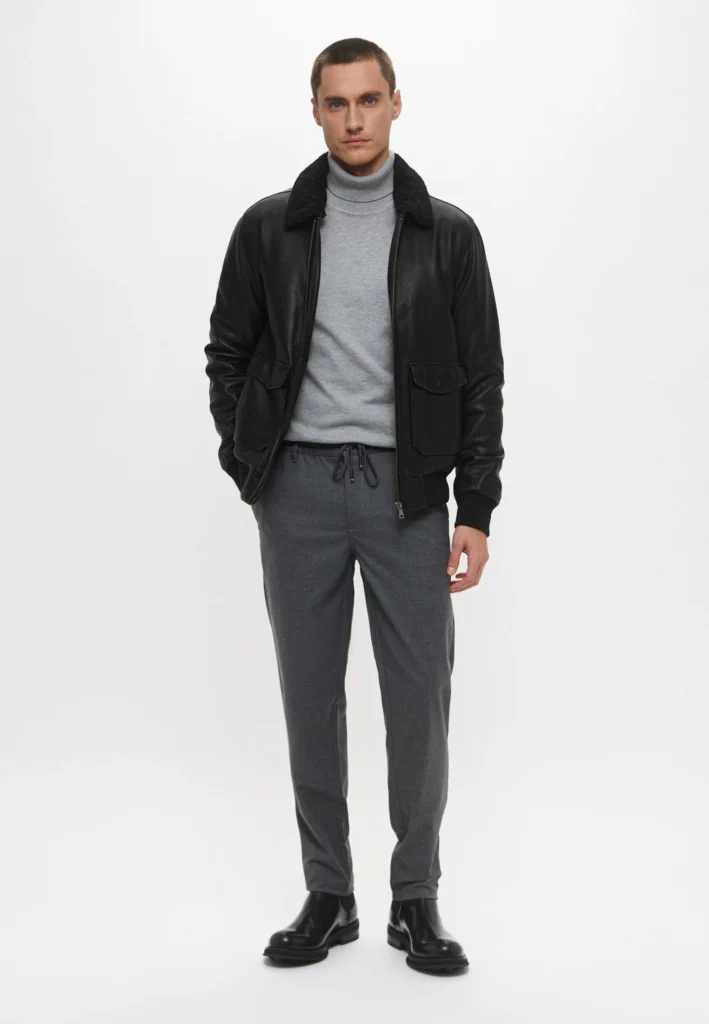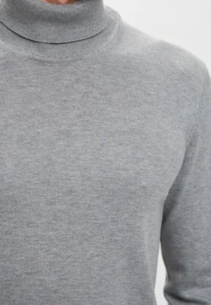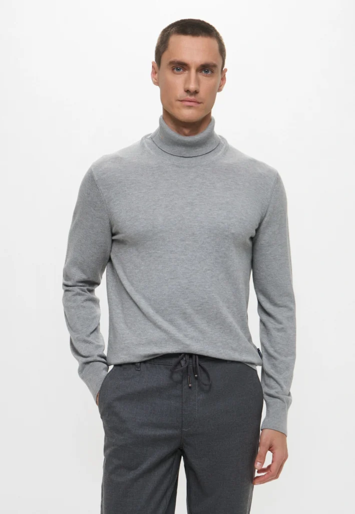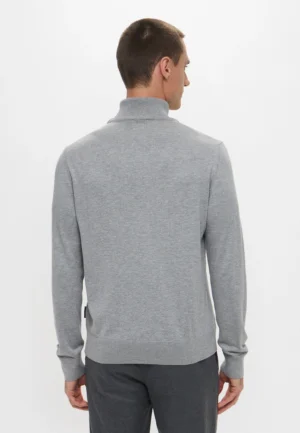 Franču zīmola HECHTER PARIS smalka adījuma vīriešu džemperis ar augstu atlokāmo apkakli pelēkā krāsā. Izgatavots no plāna modāla un kokvilnas maisījuma materiāla. Papildināts ar smalki rievotu apdari un zīmola logotipa logotipa emblēmu sānu vīlē.