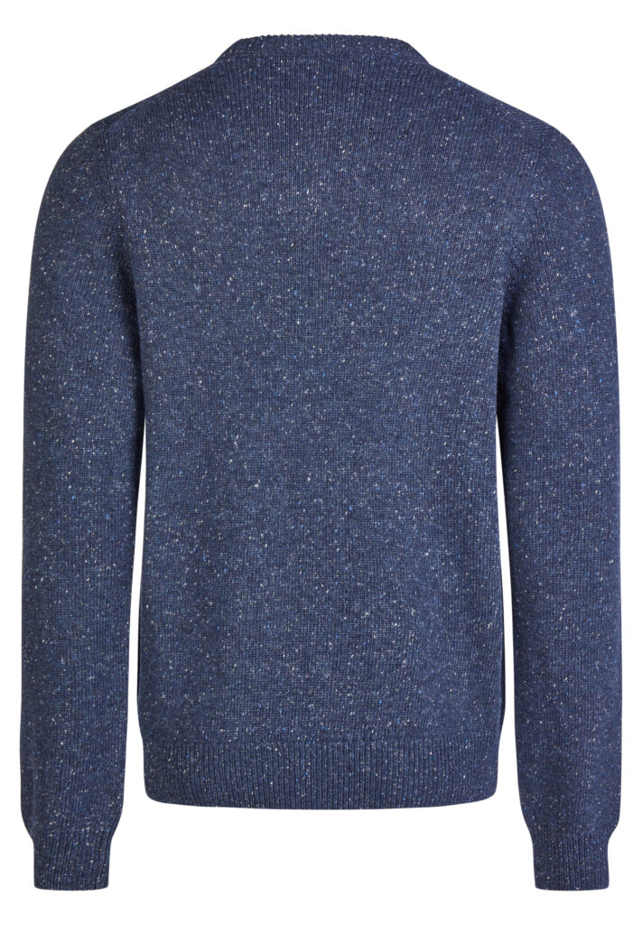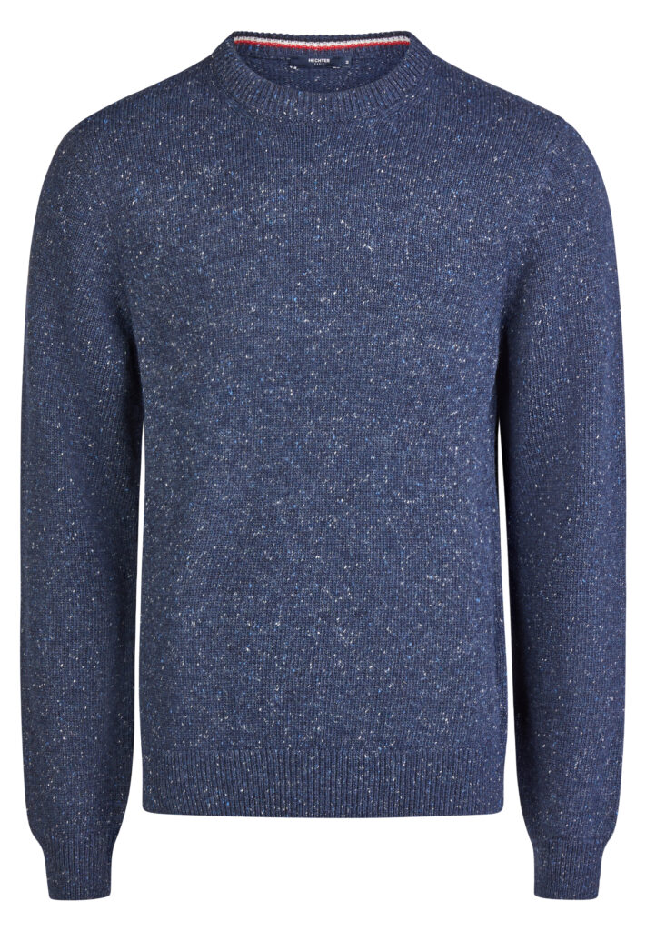 Franču zīmola HECHTER PARIS adīts klasiska dizaina džemperis pelēcīgi zilā krāsā ar smalki raibu struktūru. Izgatavots no vilnas un viskozes maisījuma dzijas. Papildināts ar smalki rievotu apdari un zīmola emblēmu sānu vīlē.