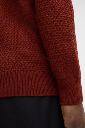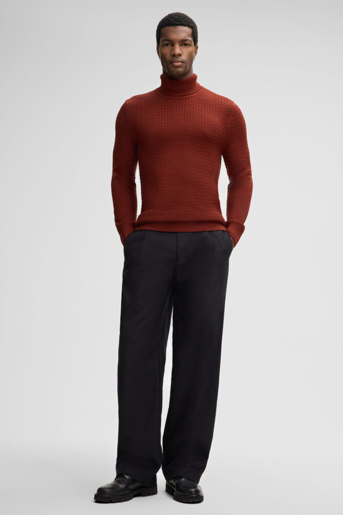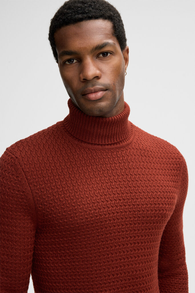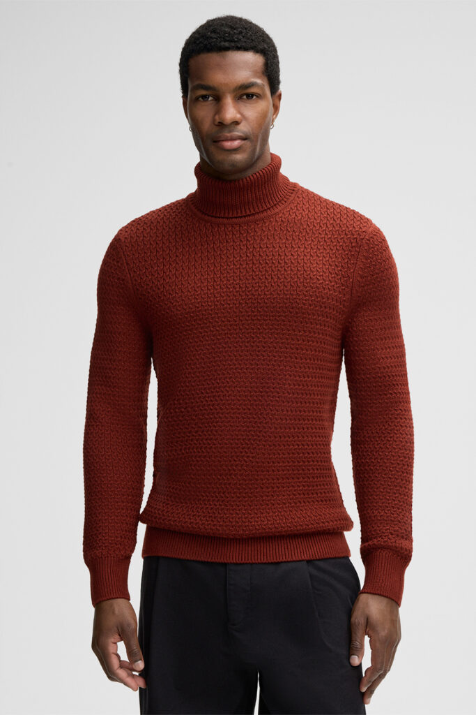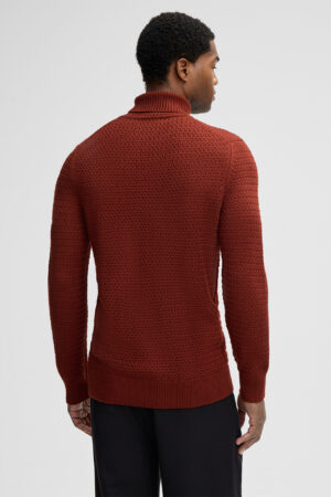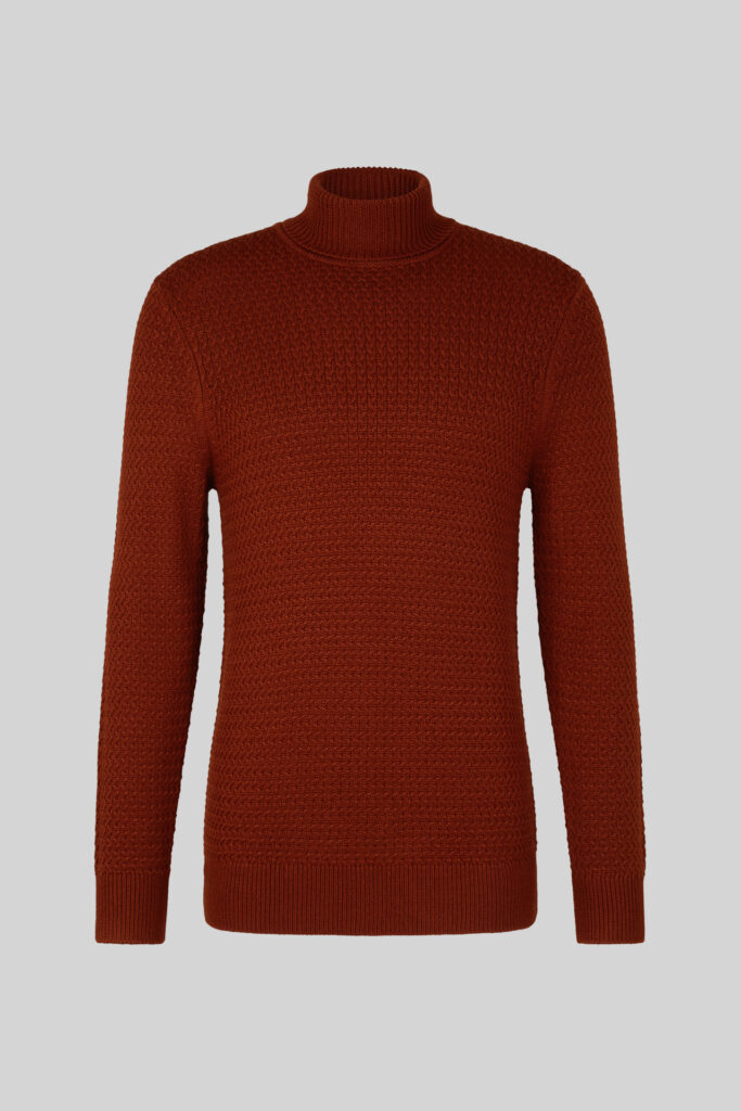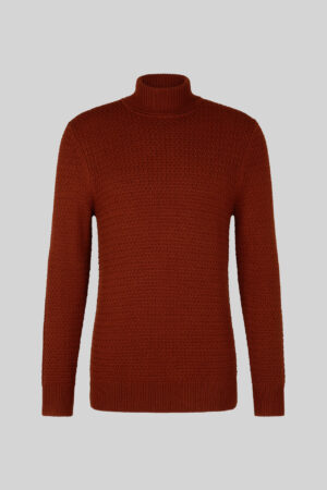 Šveices modes zīmola Strellson adīts vīriešu džemperis ar augstu atlokāmo apkakli rudi brūnā krāsā. Izgatavots no vilnas un poliakrila dzijas dekoratīvā pīnīšu adījuma rakstā. Papildināts ar rievotu apdari.