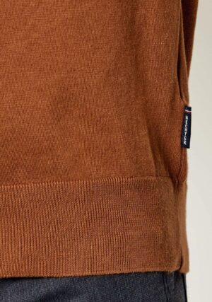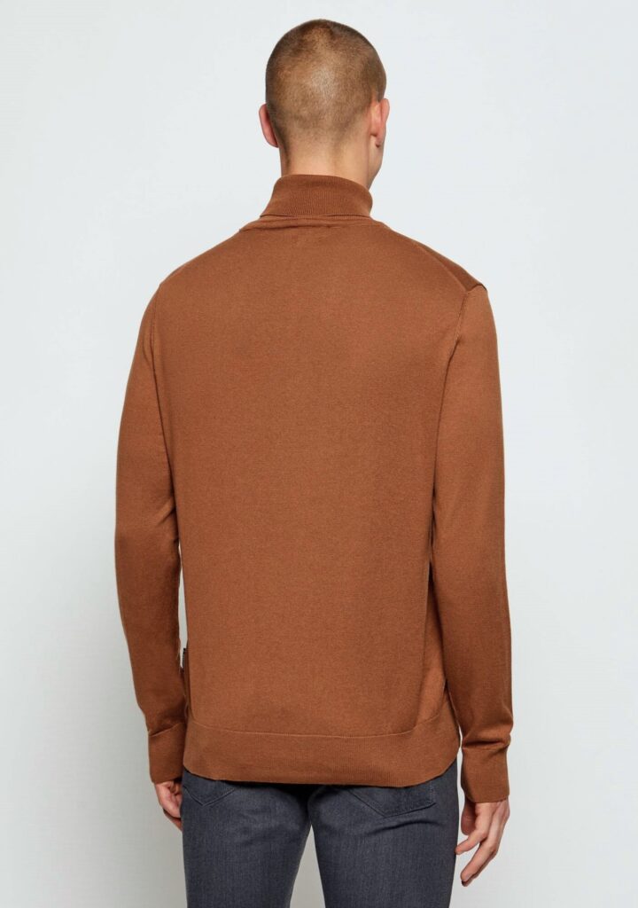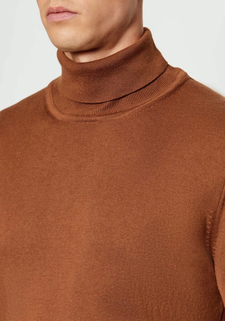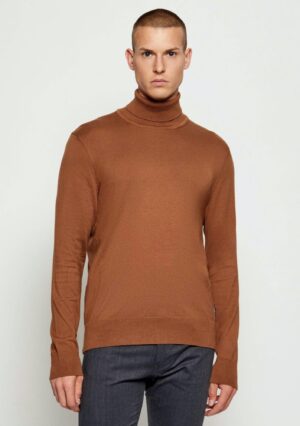 Franču zīmola HECHTER PARIS smalka adījuma vīriešu džemperis ar augstu atlokāmo apkakli zeltaini brūnā krāsā. Izgatavots no plāna modāla un kokvilnas maisījuma materiāla. Papildināts ar smalki rievotu apdari un zīmola logotipa logotipa emblēmu sānu vīlē.