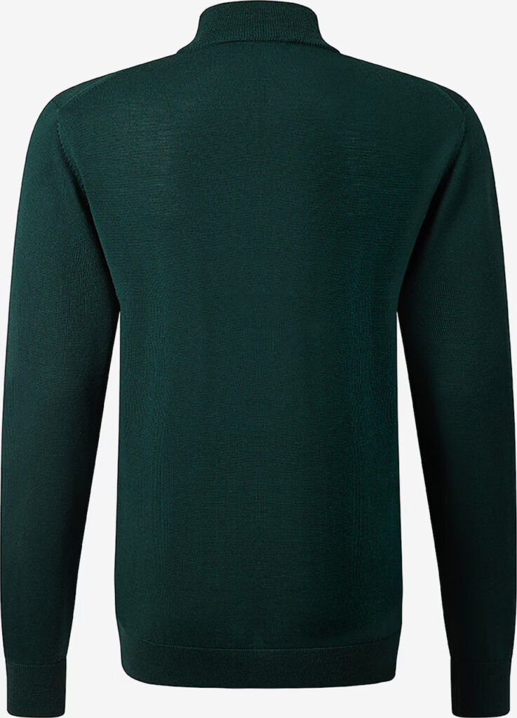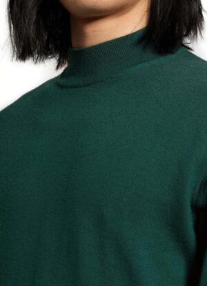 Austriešu premium klases modes zīmola Baldessarini smalka adījuma vīriešu džemperis tumši zaļā krāsā ar paaugstinātu apkakli. Izgatavots no plānas un mīkstas jaunvilnas dzijas. Papildināts ar smalki rievotu apdari.
