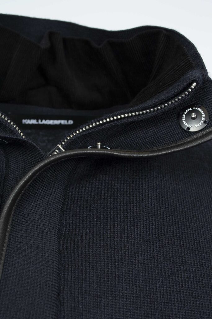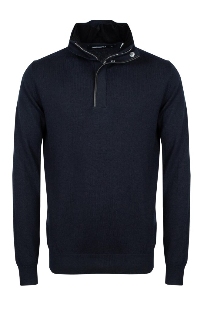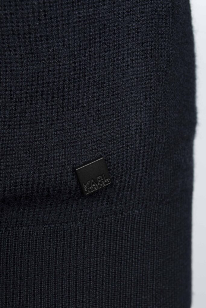 Vācu luksusa zīmola Karl Lagerfeld smalka adījuma vīriešu džemperis ar slēptu spiedpogu un rāvējslēdzēja aizdari. Izgatavots no mīkstas augstākās kvalitātes vilnas dzijas tumši zilā krāsā. Papildināts ar zīmola logotipa akcentiem un detaļām.