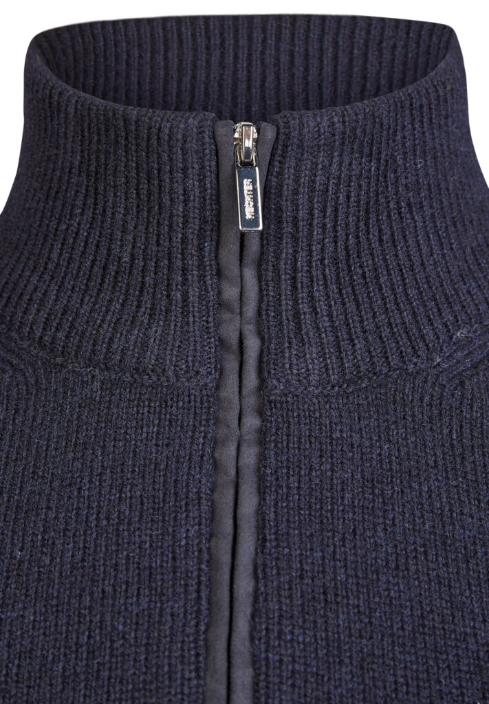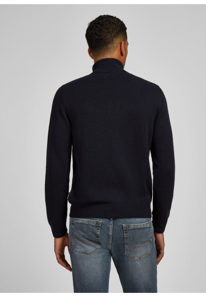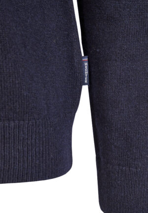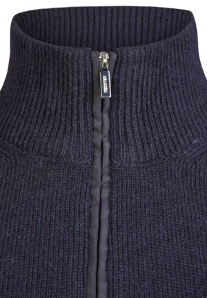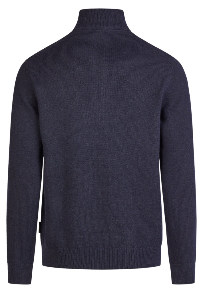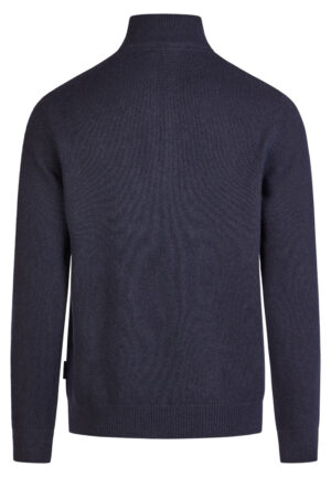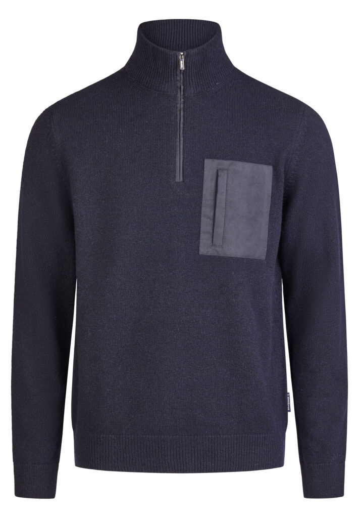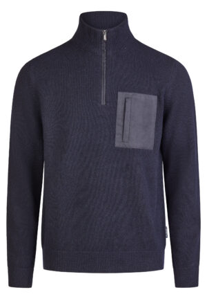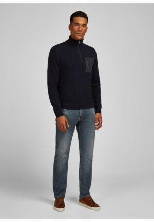 Franču zīmola HECHTER PARIS adīts vīriešu džemperis ar augstu apkakli un rāvējslēdzēja aizdari tumši zilā krāsā. Izgatavots no vilnas un viskozes maisījuma dzijas. Akcentēts ar uzšūtu zamšādas imitācijas krūšu kabatu un zīmola logotipa detaļām.