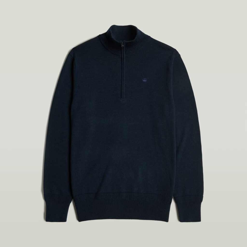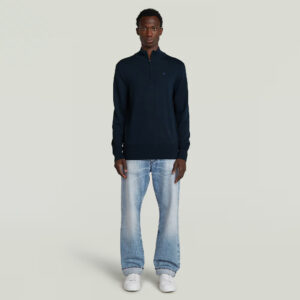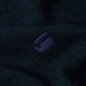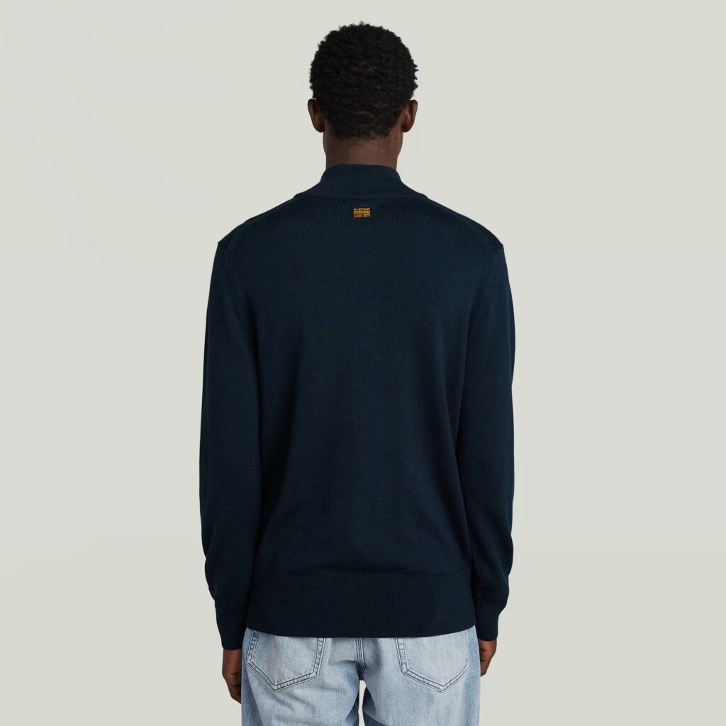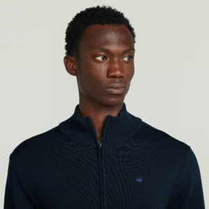Nīderlandes zīmola G-Star Raw tumši zils smalka adījuma vīriešu džemperis ar augstu apkakli un rāvējslēdzēja aizdari. Izgatavots no 100% merino vilnas dzijas. Papildināts ar dekoratīvu, smalki rievotu apdari. Akcentēts ar vientoņa logo izšuvumu un kontrastējošu zīmola emblēmu pie apkakles mugurpusē.